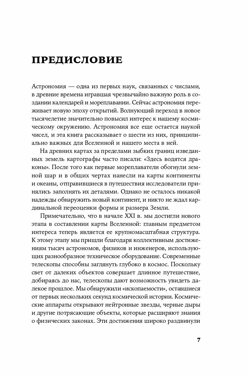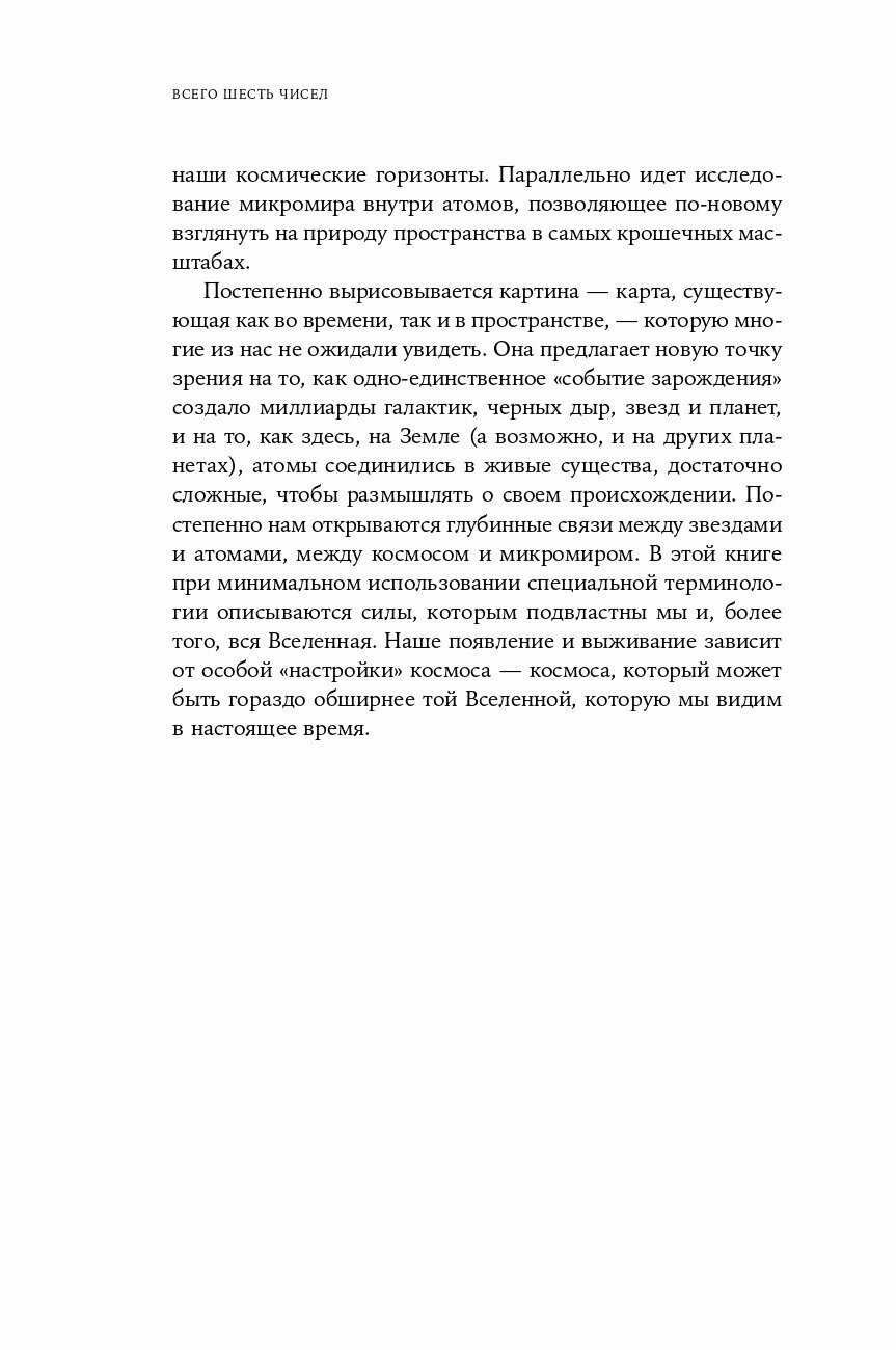 В книге всемирно известного астрофизика, члена Королевского астрономического общества сэра Мартина Риса описываются фундаментальные силы, управляющие нашей Вселенной. Автор утверждает, что расширяющаяся Вселенная может быть определена всего шестью числами: N, ε ,Ω, λ, Q, D, каждое из которых играет особую и решающую роль в ее эволюции, а вместе они определяют ее развитие и потенциал возможностей. Два из них связаны с основными силами; другие два определяют размер и общую структуру Вселенной и показывают, будет ли она существовать вечно; еще два говорят о свойствах самой Вселенной. Если бы любое из них было чуть чуть другим, не было бы звезд и не могла бы существовать жизнь. Мы могли появиться — и существуем сейчас — только во Вселенной с правильной комбинацией этих основополагающих чисел. А потому осознание этого дает совершенно новую точку зрения на Вселенную и наше место в ней, а также на саму природу физических законов. Мартину Рису удалось доступным языком, без использования сложного математического аппарата описать ключевые понятия космологии, которая стремительно развивается и сегодня находится на переднем крае науки.