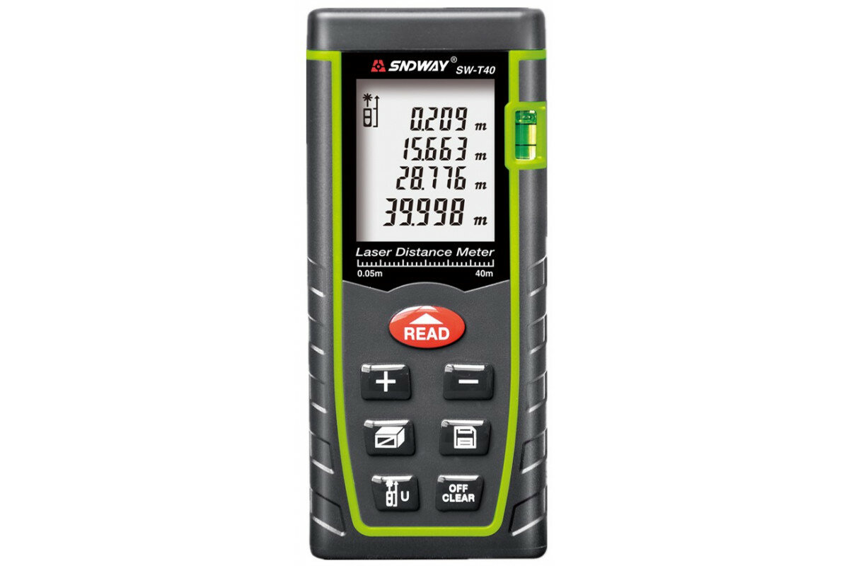 Лазерный дальномер SNDWAY SW-T40 - это профессиональный измерительный инструмент с улучшенными рабочими характеристиками для точных работ! Рабочий диапазон SNDWAY SW-T40 составляет до 40 метров с допустимой погрешностью не более 2.0 мм на всей длине замера. Полный набор доп. функций: расстояние, высота по теореме Пифагора, площадь, объем, непрерывное измерение, память на 30 измерений, подсветка дисплея и пр. возможности в работе.
