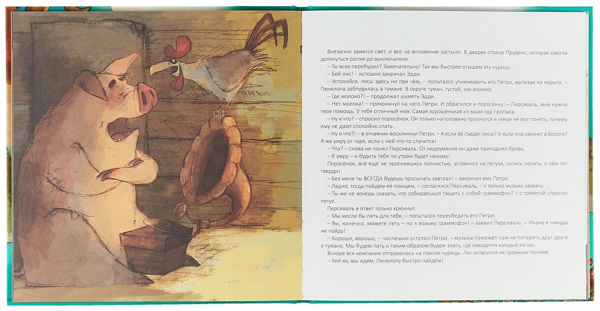 Кстати, о Пенелопе. Эта самоуверенная цыпа и есть виновница всего переполоха на ферме. Она видите ли, предпочитает по вечерам прогуливаться в лесу. Никто ее не отговаривает, ведь за день разговоры о родословной со времен динозавров успевают и поднадоесть. И вот один необычный вечер начинается как совсем обычный, животные готовятся ко сну, заняты рутинными делами, а Пенелопа уходит в лес. Все бы ничего, да петух Петри точно знает когда Пенелопа приходит назад, ведь она приносит ему бутерброд и остаётся болтать до рассвета, а тут ни тебе бутерброда, ни душевной компании. Петри забил тревогу (вы только подумайте, Петри! Это вам не Петя- петушок) и бросился в курятник. Цыпу не нашел, зато нашел Пруденс, которая всегда помогает в беде. Хотел бы без шуму, но перебудил всех. И вот представьте, как вся эта прекрасная компания со свином, старым воякой Эдди и граммофоном на спине коровы, ведь Персиваль не может без музыки! отправилась на поиски в темный лес.