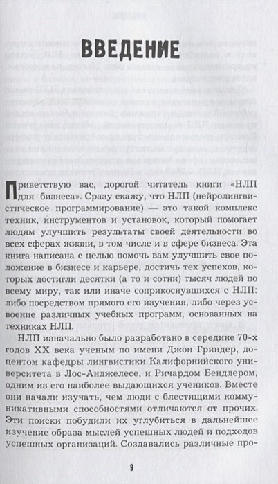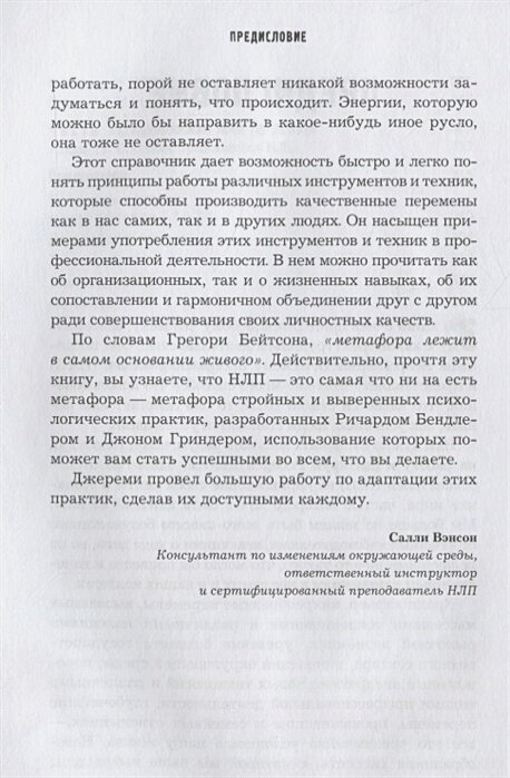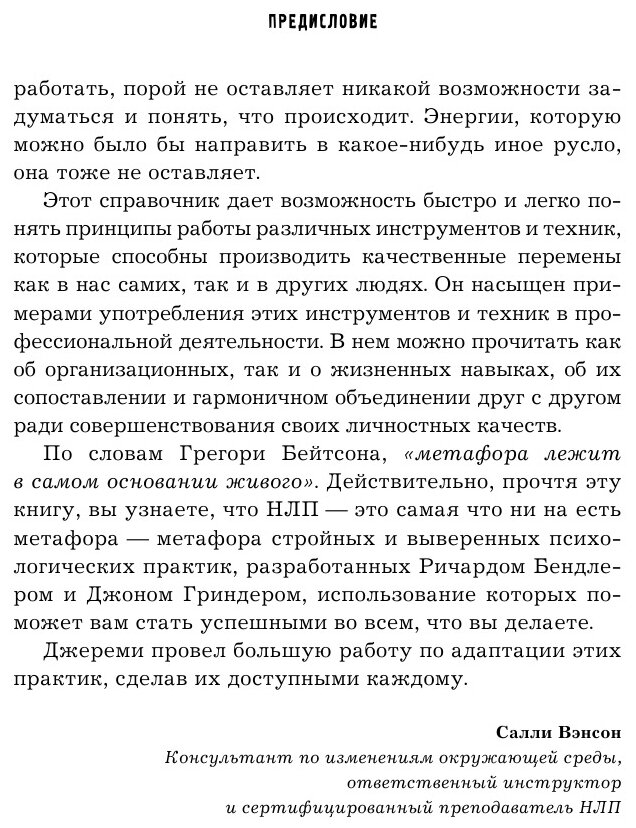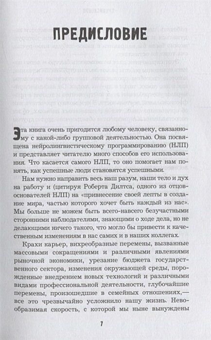 НЛП изумительный инструмент в творческом решении жизненных ситуаций во всех сферах коммуникации. Книга позиционируется как справочник предназначенный для целевой аудитории в бизнес-коммуникации, но сделана поправка на возможность применения техник НЛП в повседневной жизни. Неоспоримым достоинством книги является легкость и доступность изложения материала. Читается как художественная литература, но не только со знанием, а и с пониманием НЛП. Думаю это заслуга как автора, так и переводчика. Приобрел сам, рекомендую другим.