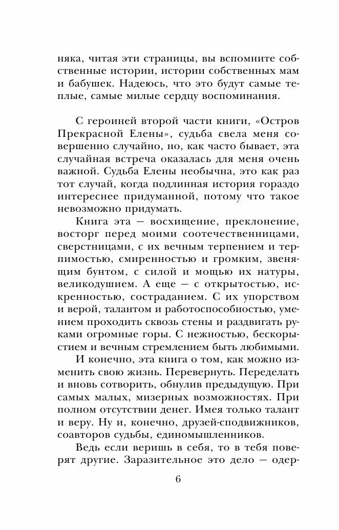 У Метлицкой всегда так - что не книжка, то уютная проза. И эта не стала исключением. Книга состоит из двух частей. Одна - автобиографична, про самого автора, её родственников (в основном женщин) и событий произошедших с ними. Вторая часть - про подругу Метлицкой, некую Елену, проживающую в Плесе с мужем иностранцем, открывшем для себя Россию и построившем бизнес в ней.