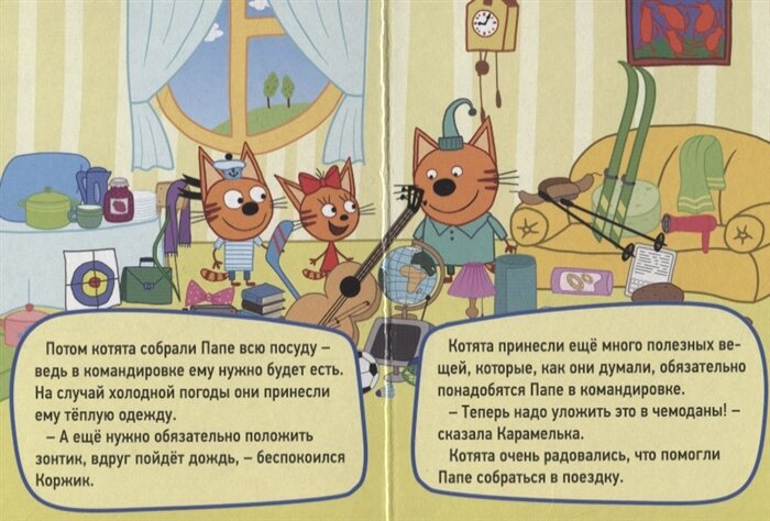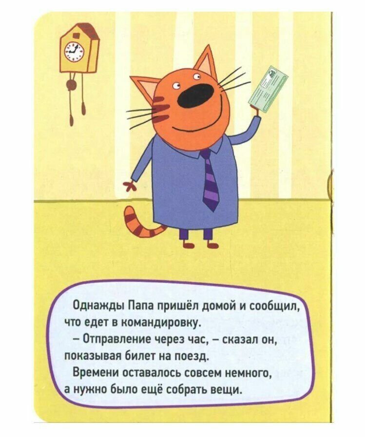 Моя дочка очень любит мультфильм "Три кота" и потому, когда я увидел в продаже данную книгу не мог пройти мимо. Если попытаться сказать совсем коротка, то её содержание - это содержание серии "Командировка" одноименного мультфильма, в которой Коржик, Карамелька и Компот (да-да-да, я и сам не знаю зачем в моей голове храниться эта "важная" информация) собирают папу-кота в командировку. Формат книги удобный - легко помещается ребенку в руки, картон плотный, иллюстрации точь-в-точь мультяшные, а цена - ну просто смешная. Грех было не купить. Как итог - ребенок довольно тыкает пальчиков в героев любимого мультика и радостно что-то бормочет под нос на калякском языке. Рекомендую.