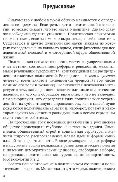 Политическая психология не занимается государственными институтами, соотношением реформ и революций, конституциями или распределением властных полномочий. Ее предмет - мысли и чувства человека, вовлеченного в политические процессы (в том числе помимо его воли и желания). В данной книге автор систематизирует и разъясняет понятия и проблемы политической психологии, позволяя читателю подготовиться к дальнейшему самостоятельному изучению предмета. Ориентация на собственный опыт и опыт экспертов, на логическую связь между политико-психологическими понятиями и проблемами позволили автору создать ясную картину современной политической психологии.
