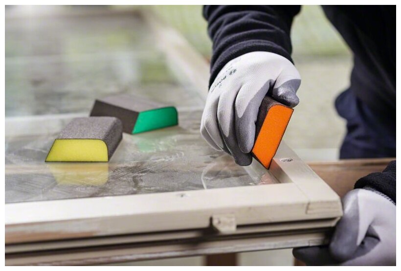Губка применяется для ручного шлифования преимущественно плоских поверхностей. С ее помощью можно работать по древесине, краске, старому лаку, металлу и пластику. Можно использовать для мокрого шлифования, но нельзя применять данную губку совместно с растворителем!