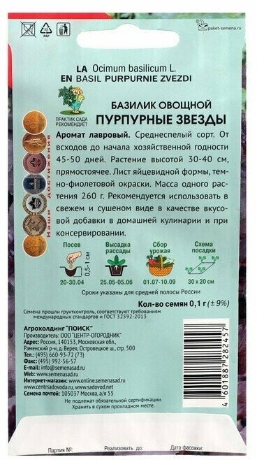 Семена пряных трав и салатов ПОИСК Семена Базилик пурпурные звезды 0,1 гр