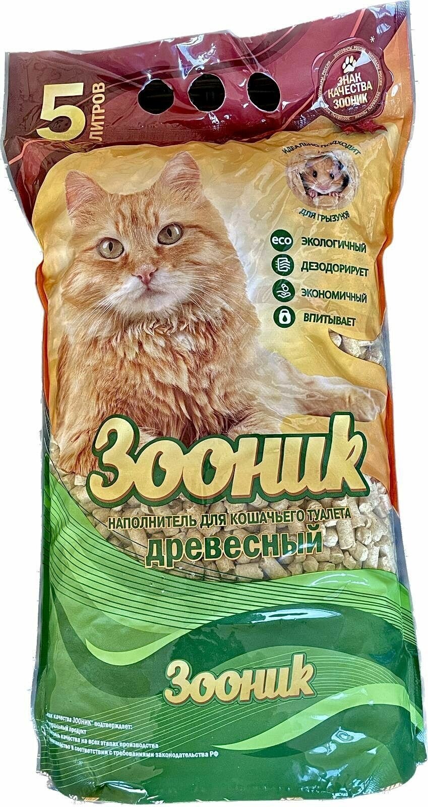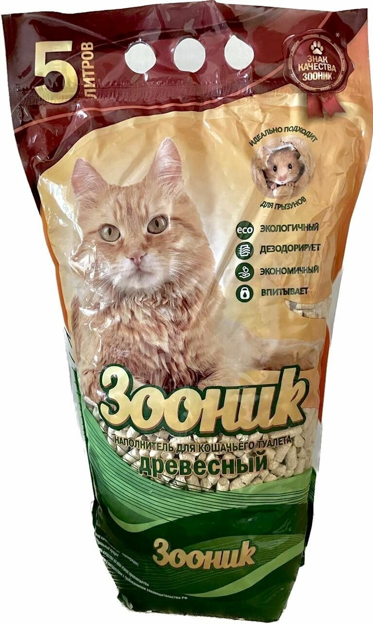 Впитывающий наполнитель Зооник в пластиковом пакете объемом 5 литров – экологичное и экономичное решение для организации кошачьего туалета. Он изготовлен из натуральной древесины и спрессован по специальной технологии, благодаря которой пеллеты приобретают особо плотную структуру. Хвойные масла эффективно нейтрализуют запахи и борются с бактериями, обеспечивая свежесть и чистоту в туалете. При намокании гранулы выделяют легкий пихтовый аромат. Особенности Наполнитель разлагается при контакте с большим количеством воды, поэтому может утилизироваться прямо в унитаз. Опилки спрессованы очень плотно, не пачкают шерсть животных и не разносятся по всему дому на лапах. Натуральный продукт нравится практически всем кошкам и не создает проблем при переходе с другого типа наполнителя. Пеллеты подходят для содержания различных видов грызунов и мелких животных: крыс, мышей, кроликов, шиншилл и пр.
