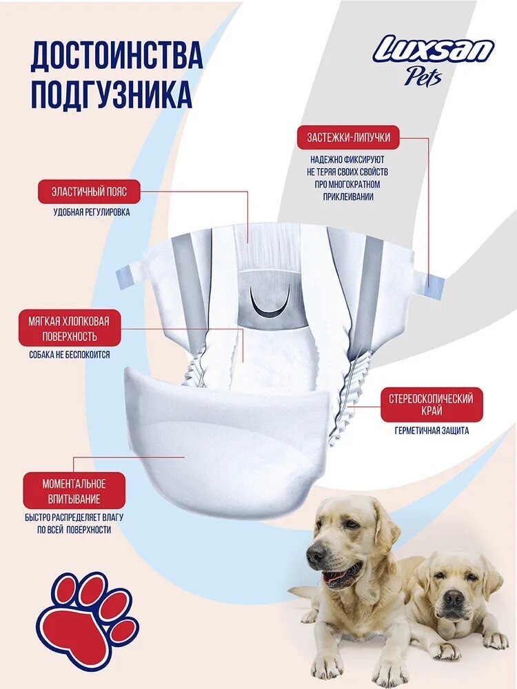 Подгузники Luxsan Pets M предназначены для домашних питомцев. Качественные и прочные, они выполнены из специального нетканого материала, дополнены впитывающими компонентами для максимальной защиты от влаги и неприятного запаха. Не выделяют токсических веществ, полностью безопасны для животного и человека. Особенности Верхний слой подгузника обеспечивает комфорт питомцу – он мягкий на ощупь и легкий. Благодаря наличию микропор особого адсорбента, влага быстро впитывается и остается внутри. При этом не возникает неприятного запаха и парникового эффекта, что обеспечивает максимальный комфорт животного. По бокам и на линии талии модель дополнена эластичными резинками и надежными липучками. Поэтому подгузник легко надевать, не причиняя питомцу боли. Применяется при недержании мочи, передержке перед родами, во время течки, в период болезни и послеоперационном периоде. Подходит для домашнего использования, а также для поездок и путешествий. Для сохранения свойств и предотвращения деформации, требуется беречь от воздействия влаги.