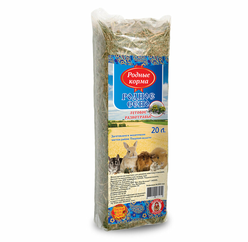 Родное сено выращивается и заготавливается на специальных посевных полях, в экологически чистом районе Тверской области на берегу великой русской реки Волги-матушки. Обеспечивая безопасность питания для наших питомцев, весь технологический процесс строго контролируется на всех этапах производства, позволяя сохранить цвет, вкус, аромат и максимум всех полезных веществ без снижения качества. Мятлик луговой — растение, богатое белковыми веществами даже в сухом виде. Горошек мышиный, богатый протеином и витамином С. Тимофеевка, имеющая уникальное содержание аминокислот, как аргинин и лизин, кальций, фосфор. Овсяница луговая, одно из самых лучших растений, отличающееся высокой кормовой ценностью. Сено, в составе которого большая доля приходится на овсяницу, отличается очень высоким качеством. Оно содержит до 10% протеина, 30% клетчатки. Клевер — богатое протеином, сено из него считается одним из самых питательных в белковом отношении.