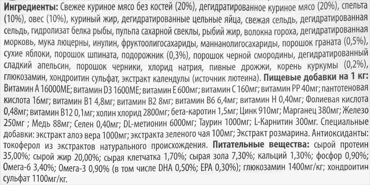 | Состав | Спельта, овес, ягненок, черника. Полнорационный корм для взрослых собак. Ингредиенты: Свежая баранина без костей (20%), дегидратированное мясо ягненка (18%), спельта (10%), овес (10%), дегидратированные цельные яйца, свежая сельдь, дегидратированная сельдь, животный жир, рыбий жир, пульпа сахарной свеклы, волокна гороха, сушеная морковь, мукa люцерны, инулин, фруктоолигосахариды, маннанолигосахариды, порошок черники(0,5%), сухие яблоки, порошок граната, дегидратированный сладкий апельсин, порошок шпината, подорожник (0,3%), порошок черной смородины, хлорид натрия, пивные дрожжи, корень куркумы (0,2%), глюкозамин, хондроитин сульфат, экстракт календулы (источник лютеина). |
