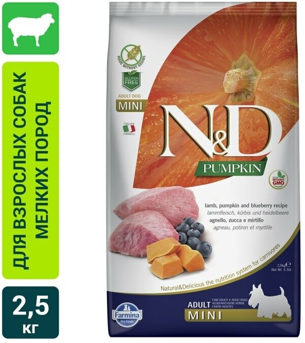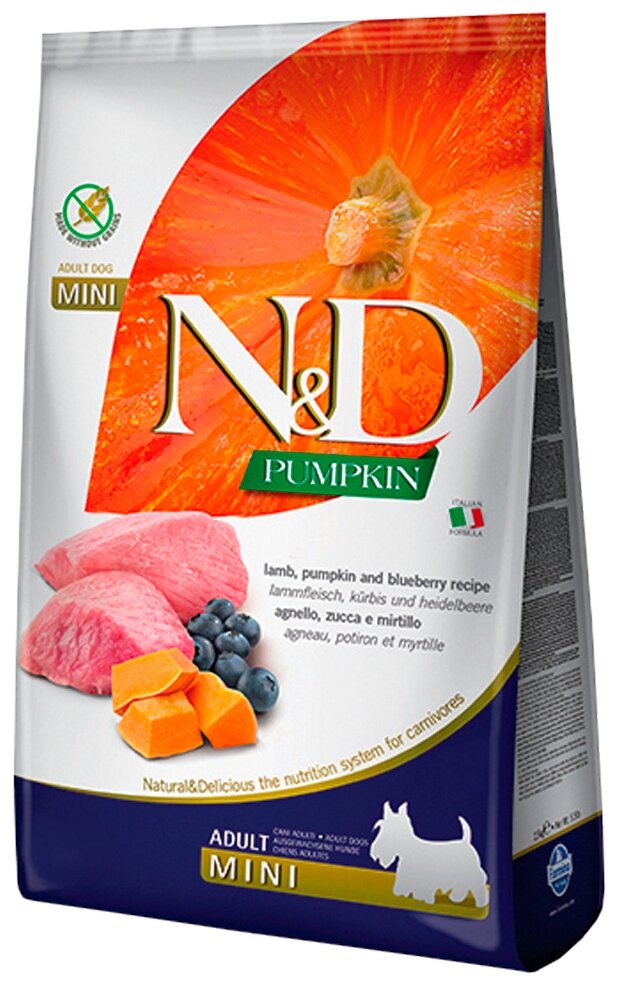 Фармина сухой сухой корм для собак :Farmina N&D Pumpkin Line Lamb & Blueberry Mini Беззерновой корм для взрослых собак мелких пород Ягненок с черникой и Тыква 800гр для животных. Привлекательный вкус деликатесного ягненка. Понравится даже самым привередливым к пище питомцам.