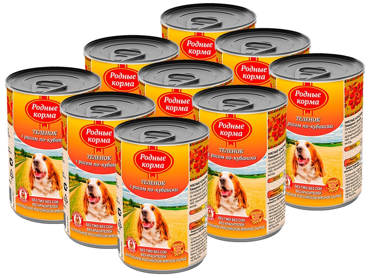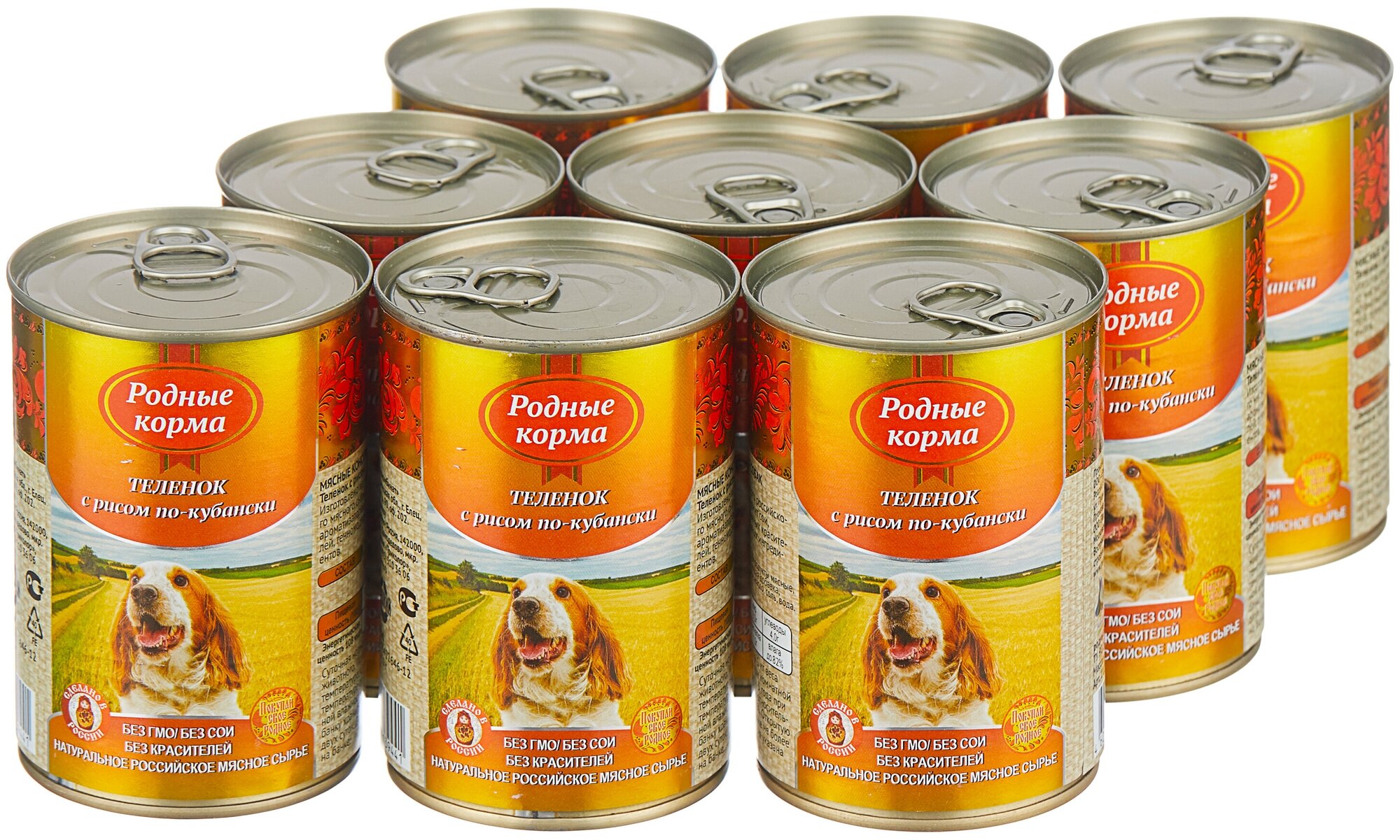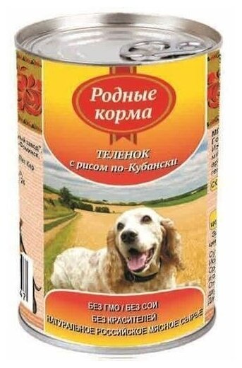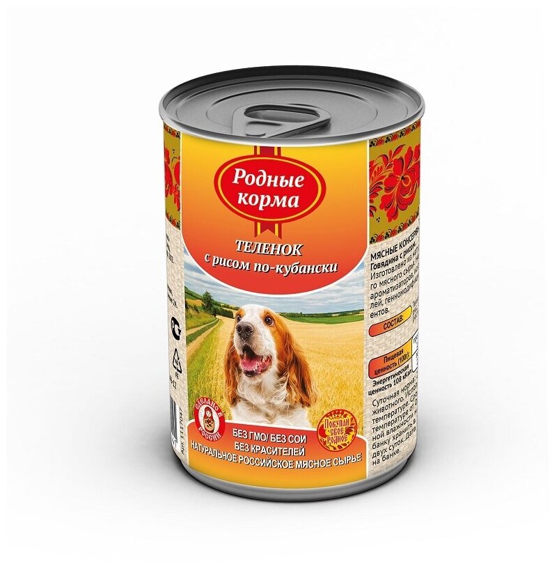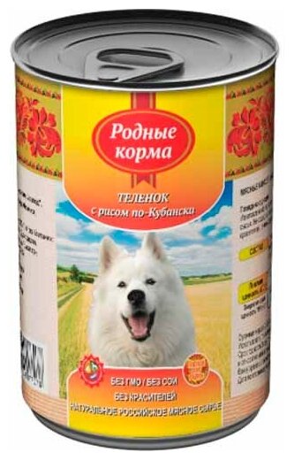 Влажный корм Родные корма Елец для взрослых собак теленок с рисом по кубански 410г (66045)