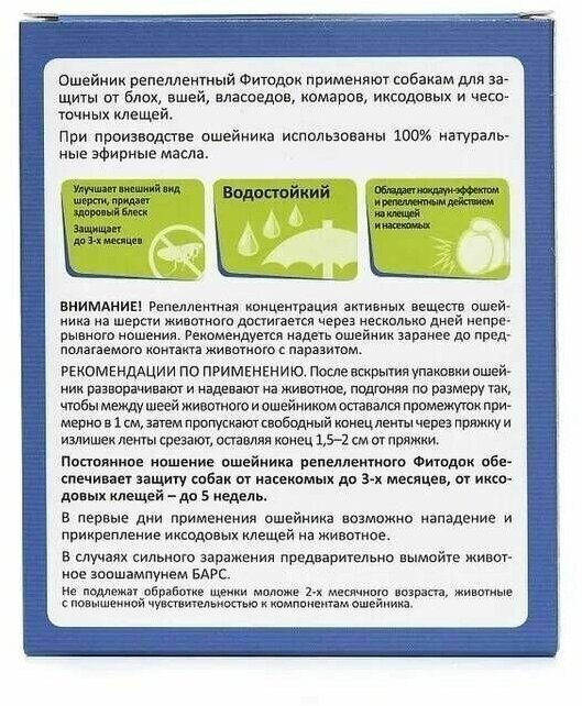 Репелентные ошейники, ошейники на эфирных маслах, безвредные ошейники от блох и клещей. Ошейник представляет собой полимерную ленту для собак от светло-синего до темно-синего цвета, для кошек от светло-бирюзового до темно-бирюзового цвета со слабым специфическим запахом, с фиксатором. Ошейник репеллентный Фитодок выпускают длиной 80см (для крупных собак), 50см (для средних собак) и 35см (для мелких собак и кошек), в герметично закрытом бумажном пакете, упакованным в картонную пачку. Обладает выраженным репеллентным действием в отношении иксодовых и чесоточных клещей, а также блох, вшей и власоедов, паразитирующих у собак и кошек.