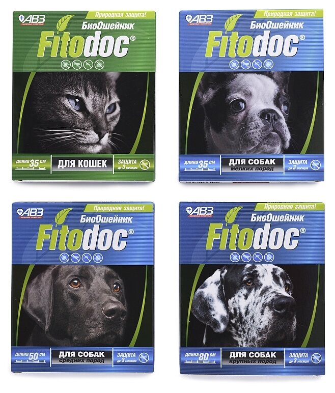 Репелентные ошейники, ошейники на эфирных маслах, безвредные ошейники от блох и клещей. Ошейник представляет собой полимерную ленту для собак от светло-синего до темно-синего цвета, для кошек от светло-бирюзового до темно-бирюзового цвета со слабым специфическим запахом, с фиксатором. Ошейник репеллентный Фитодок выпускают длиной 80см (для крупных собак), 50см (для средних собак) и 35см (для мелких собак и кошек), в герметично закрытом бумажном пакете, упакованным в картонную пачку. Обладает выраженным репеллентным действием в отношении иксодовых и чесоточных клещей, а также блох, вшей и власоедов, паразитирующих у собак и кошек.