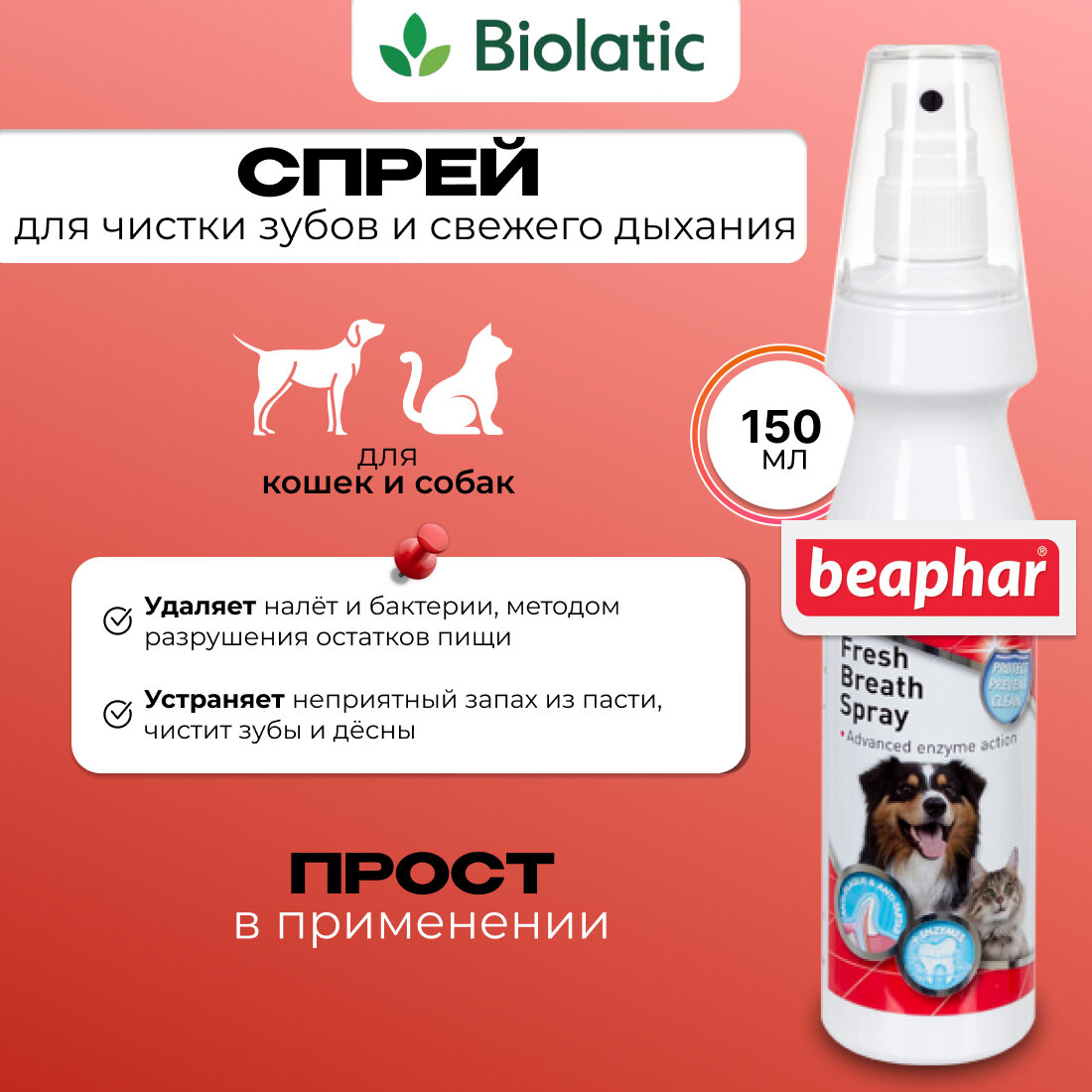 | Способ применения | аккуратно приподнимите губу и опрыскайте зубы собаки с расстояния 5-10см (3-4 нажатия на дозатор), повторяйте процедуру ежедневно |