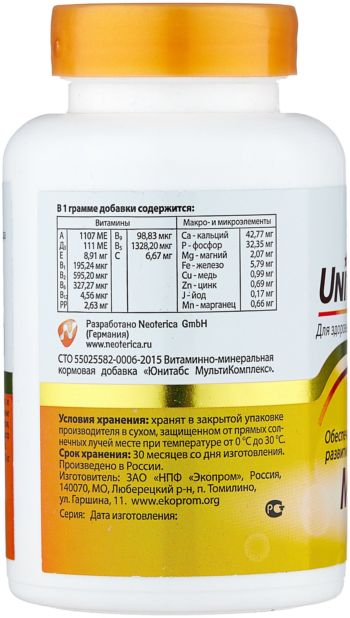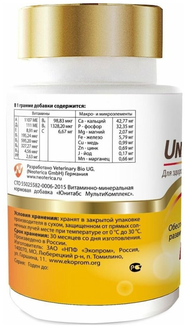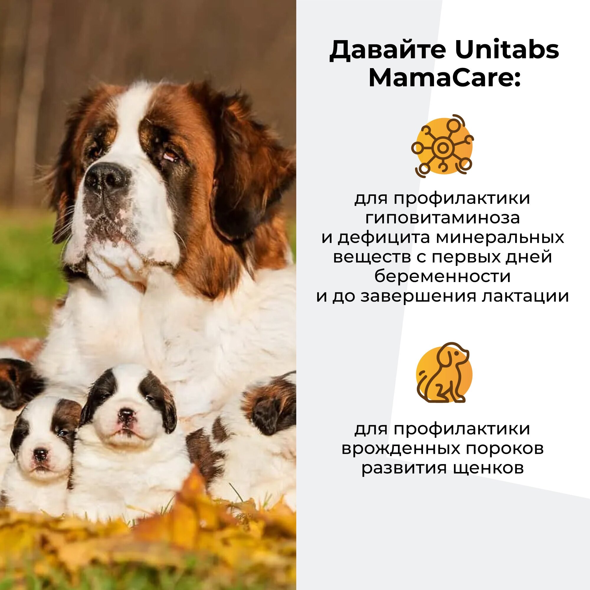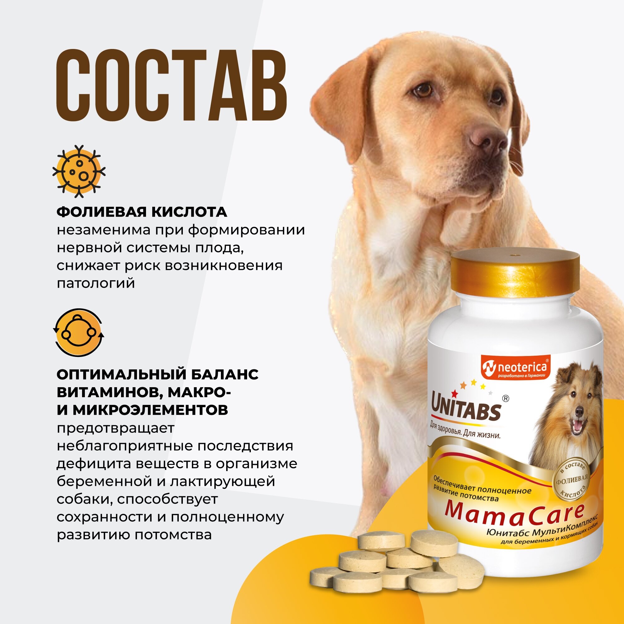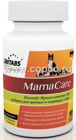 Unitabs – это серия витаминно-минеральных комплексов для собак всех возрастов и пород, которые содержат коэнзим Q10 и все необходимые витамины, макро- и микроэлементы.Формулы витаминно-минеральных комплексов Unitabs разработаны совместно с фирмой Veterinary Bio (Германия) и соответствуют европейскому стандарту качества.MamaCare для щенных и кормящих собак, 100 таб.Обеспечивает полноценное развитие потомства. Способствует полноценному развитию плода. Улучшает состав и секрецию молока.Применяют сукам в период беременности и лактации для нормализации обмена веществ, сохранности и полноценного развития плода, улучшения состава и секреции молока, улечшения аппетита.Добавку вводят в корм собакам или задают перорально с руки, ежедневно из расчета 1 таблетка на 10 кг массы тела. Курс применения не ограничен.