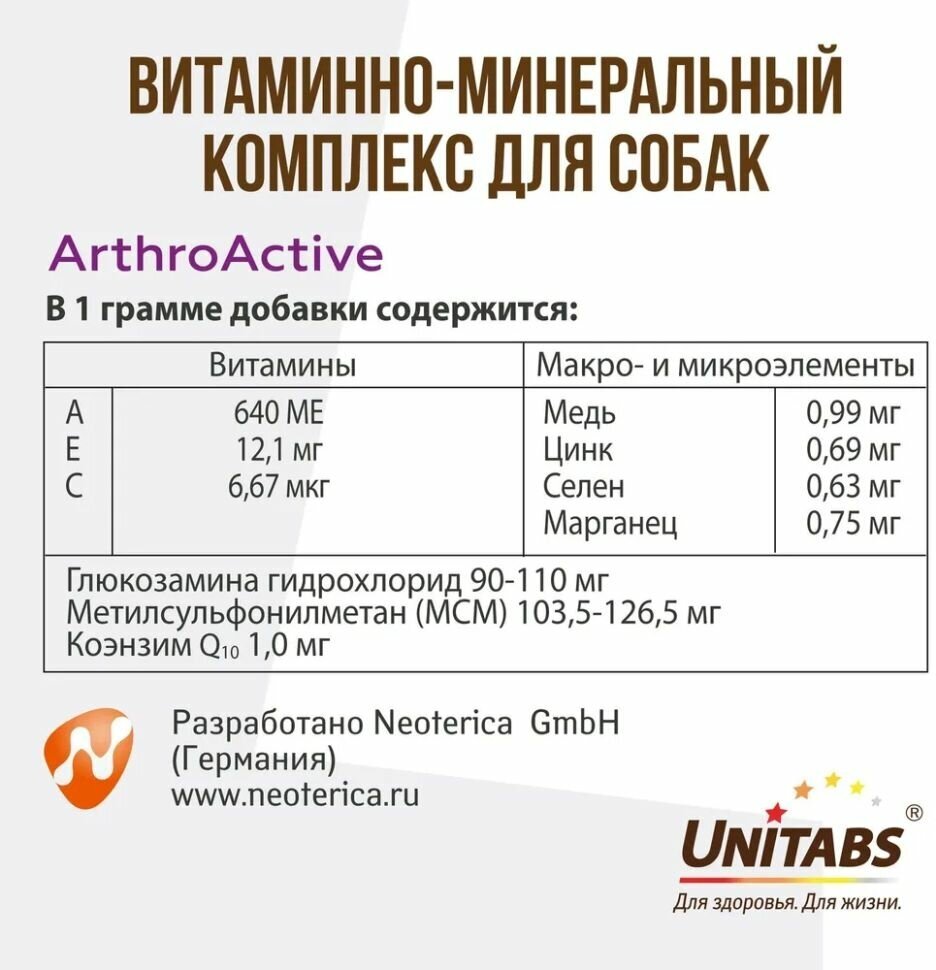 Unitabs – это серия витаминно-минеральных комплексов для собак всех возрастов и пород, которые содержат коэнзим Q10 и все необходимые витамины, макро- и микроэлементы.Формулы витаминно-минеральных комплексов Unitabs разработаны совместно с фирмой Veterinary Bio (Германия) и соответствуют европейскому стандарту качества.ArthroActive с глюкозамином и МСM, 100 таб. Укрепляет суставы, связки и сухожилия. Обладает противовоспалительным и обезболивающим действием.Юнитабс АртроАктив применяют для поддержания функции суставов и хрящей у собак крупных пород с 3-месячного возраста, у пожилых собак, у собак, имеющих лишний вес. Добавку вводят в корм или задают перорально с руки, ежедневно, 1 раз в сутки перед кормлением из расчета 1 таблетка на 10 кг массы тела.