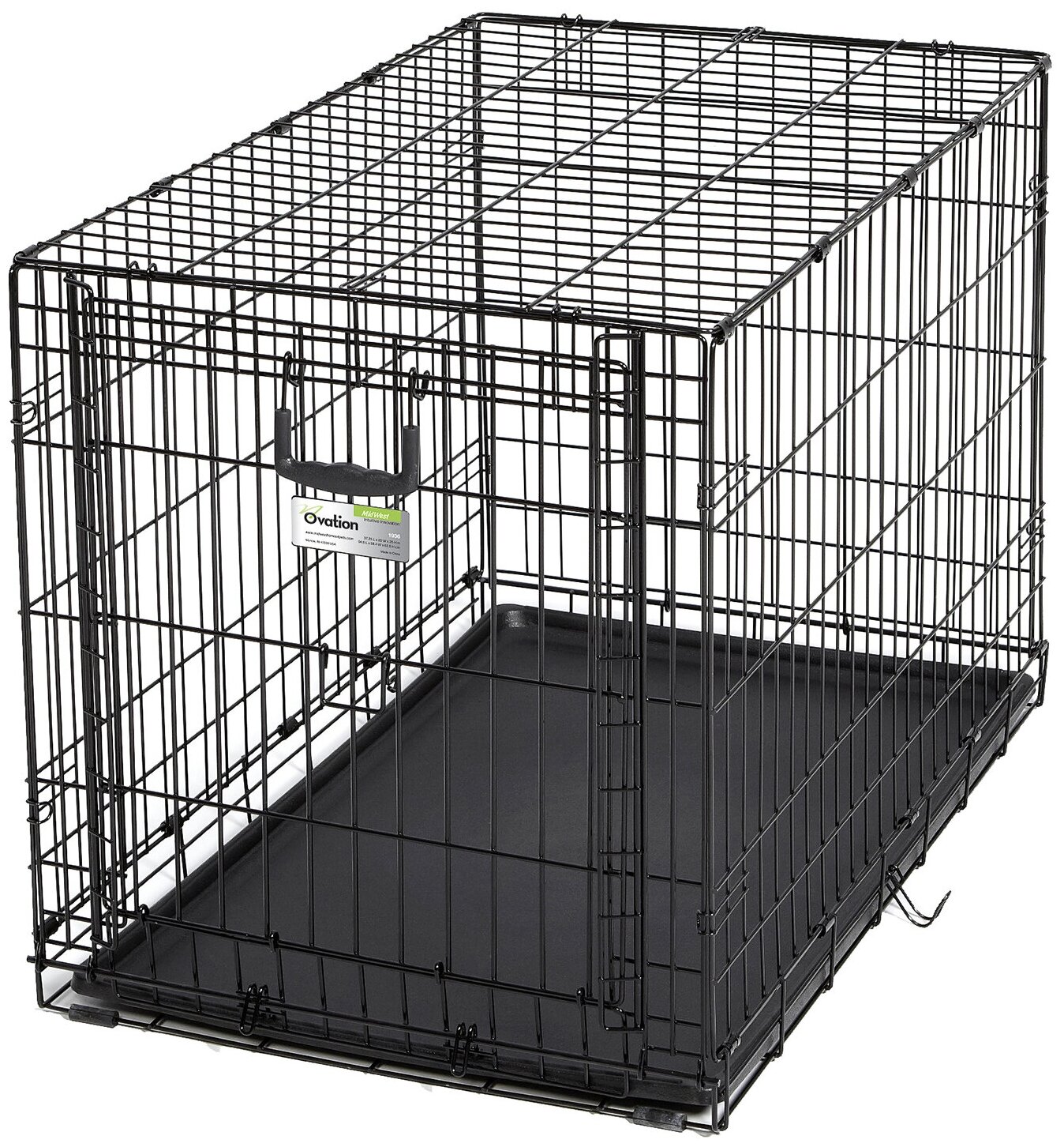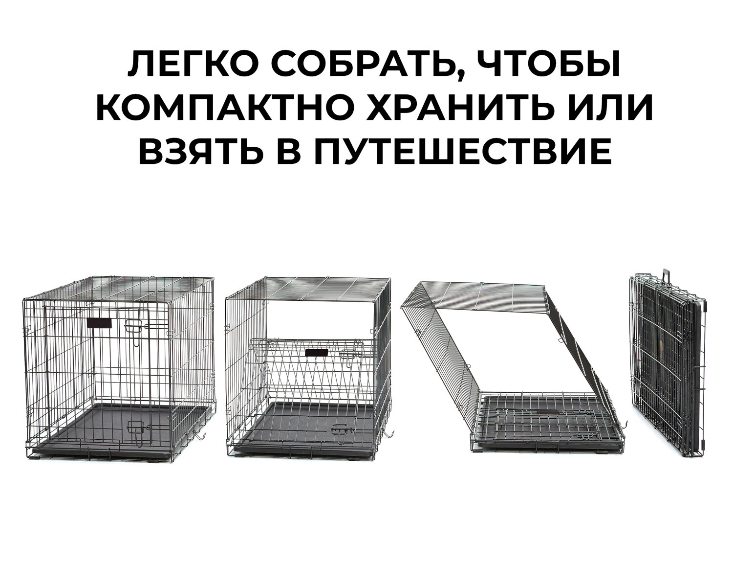 Клетка для домашних животных Ovation с одной дверью - особо прочная, компактная, с открывающейся вверх дверью. Дверь с запатентованной технологией рельсовой вертикальной системы удобно открывается вверх и размещается на крыше клетки. Это позволяет устранить необходимость в дополнительном пространстве, которое нужно для клеток с откидными дверьми, и максимально предохраняет от открытия животным. В комплект включены: разделяющая панель, пластиковый поддон и специальные пластиковые ручки для удобной транспортировки клетки в сложенном виде. Закругленная угловая защита клетки обеспечивает безопасность питомцам и людям и не повреждает поверхность, на которой размещается. Разделяющая панель позволяет создавать универсальные отсеки. Поддон из композитного пластика легко моется. Клетка легко устанавливается и складывается без использования инструментов. В сложенном виде занимает мало места.Размер клетки - 94,6х58,4х63,5h см. Вес - 10,8 кг (12,1 кг с коробкой). Цвет клетки - черный.
