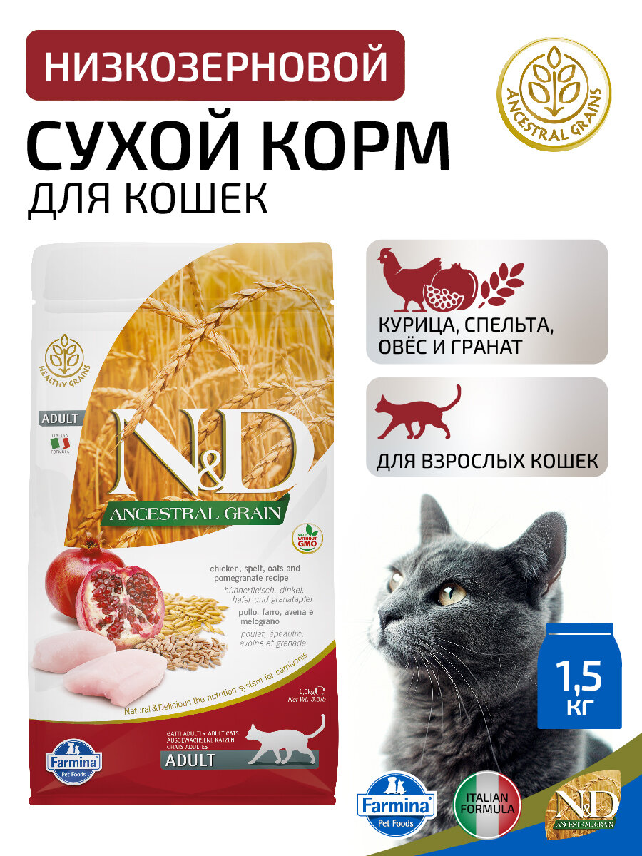Сухой корм Farmina N&D для взрослых кошек Ancestral Grain курица с гранатом 1.5кг Корм сухой Farmina N&D низкозерновой с курицей гранатом и спельтой для кошек 1.5 кг
