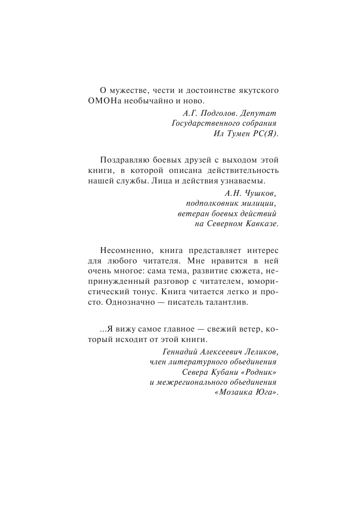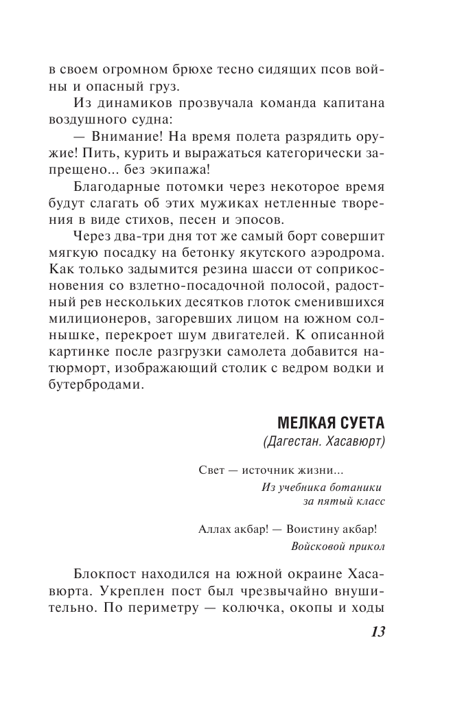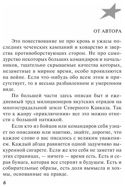 Прекрасно помню те дни, когда я собирался в свою первую командировку на войну. Было страшно. Уже в самолёте терзали совершенно непристойные мысли: "Зачем я на это согласился? Ведь семья, дети"… По прибытии стало ещё страшней. Удивительно, но через некоторое время, страх полностью исчез. В детстве мы с друзьями часто лазили по крышам многоэтажных домов. Ходили по самому краешку, болтали ногами и языками, и ведь было совершенно не боязно. А когда дома, лёжа в тёплой постели, я вспоминал об этом, в животе появлялся неприятный холодок. Так и сейчас - от некоторых эпизодов чеченской войны, становится жутковато. Но когда мы, ветераны, собираемся компанией, то вспоминаем в основном доброе, светлое и, конечно же, смешное, что и нашло отражение в этой страшной и, одновременно, веселой книге.