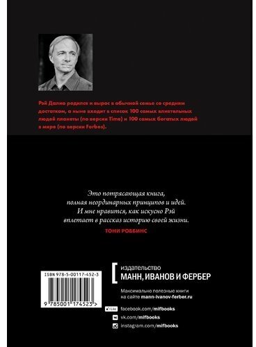 Рэй Далио входит в список 100 самых влиятельных людей планеты (по версии Time) и 100 самых богатых людей в мире (по версии Forbes). Его уникальные принципы инвестирования изменили всю отрасль, за что журнал CIO назвал его "Стивом Джобсом инвестирования". Рэй Далио считает, что добился успеха не потому, что он особенный, а потому, что его успех стал результатом применения принципов, которые он вывел, зачастую учась на своих ошибках. И эти принципы могут быть полезны другим людям.