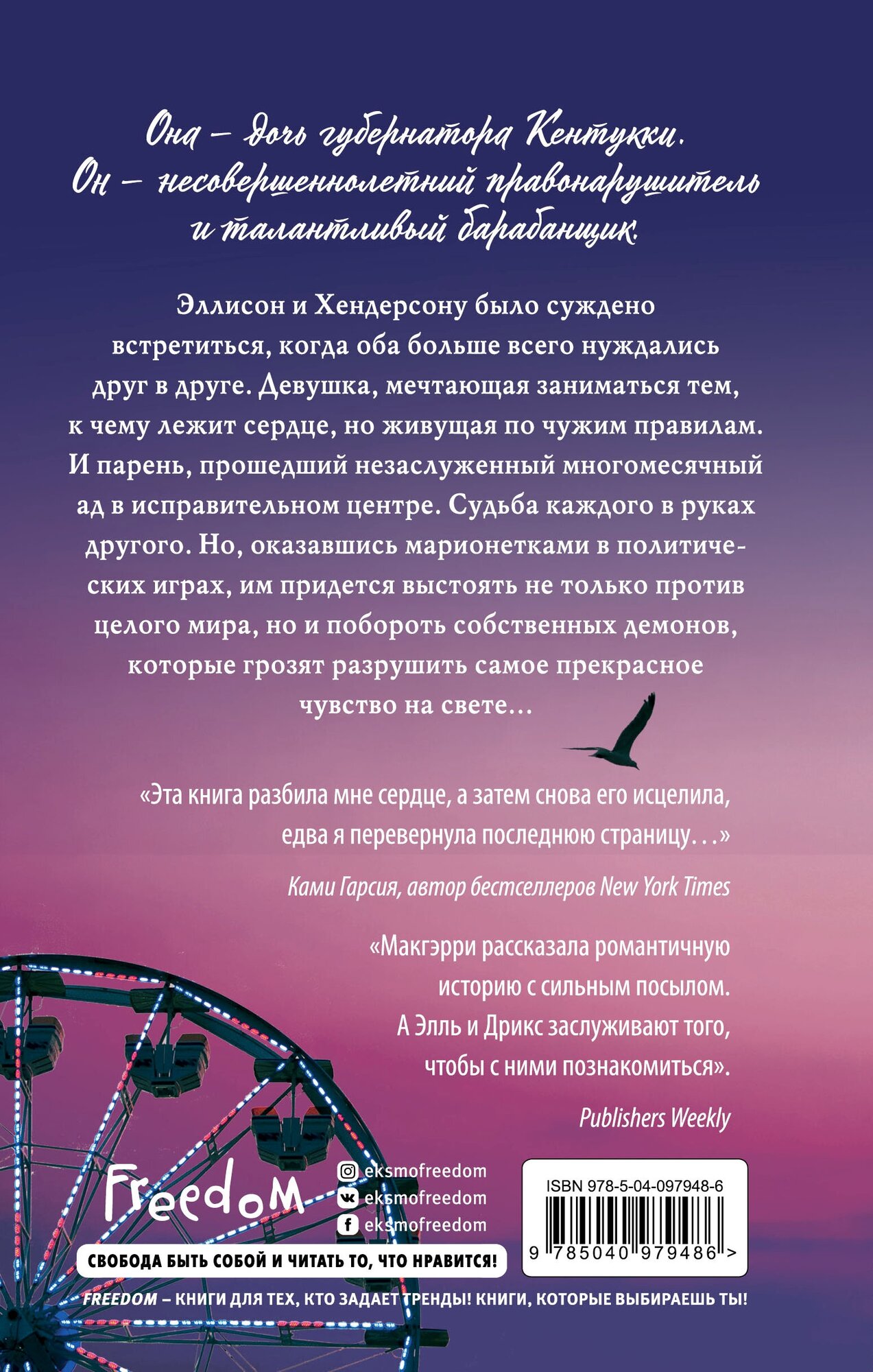 Книга затягивает своим сюжетом. Главные герои в книге -Эллисон и Дрикс. Девушка - дочь губернатора, красивая, умная, добрая. Но из-за высокого социального статуса отца, Элль должна соответствовать "образу" хорошей образованной девушки. Участие в программе отца ей не дается легко. Идеальная внешность, отточенные до совершенства движения и мимика. На публике девушка становится незнакомкой для себя, и это ее жутко расстраивает и пугает, потому что с каждым выходом в свет она теряет частичку своего сердца и души. Рано или поздно это убьет главную героиню изнутри. Дрикс - парень, у которого было больше черных полос в жизни, нежели белых. Главный герой несовершеннолетний правонарушитель и талантливый музыкант, согласившийся на сделку с прокурором, чтобы спасти близкого человека.
