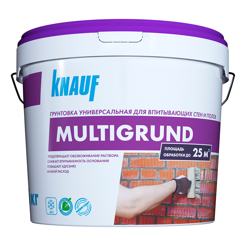 Multigrund от компании Knauf разработан для обработки бетонных, блочных, гипсовых, кирпичных, цементных и других впитывающих поверхностей. С этой грунтовкой строительные смеси схватываются более равномерно, уменьшается их расход, за счет снижения впитываемости основания и улучшения сцепления с ним. "Мультигрунд" рекомендуют использовать перед оштукатуриванием, облицовкой или монтажом Knauf-листов. Состав эффективен при устройстве стяжки, наливного пола, нанесении гипсового клея. Универсальная морозостойкая паропроницаемая грунтовка сохраняет свои характеристики при температуре до -40 градусов, поэтому идеальна для наружных работ в условиях российского климата, но не менее хороша и для отделки помещений. "Мультигрунд", на основе полимерной дисперсии, готов к применению. Он достаточно быстро сохнет, дает помещению возможность "дышать". Для удобства контроля площади обработки состав имеет желтый цвет.