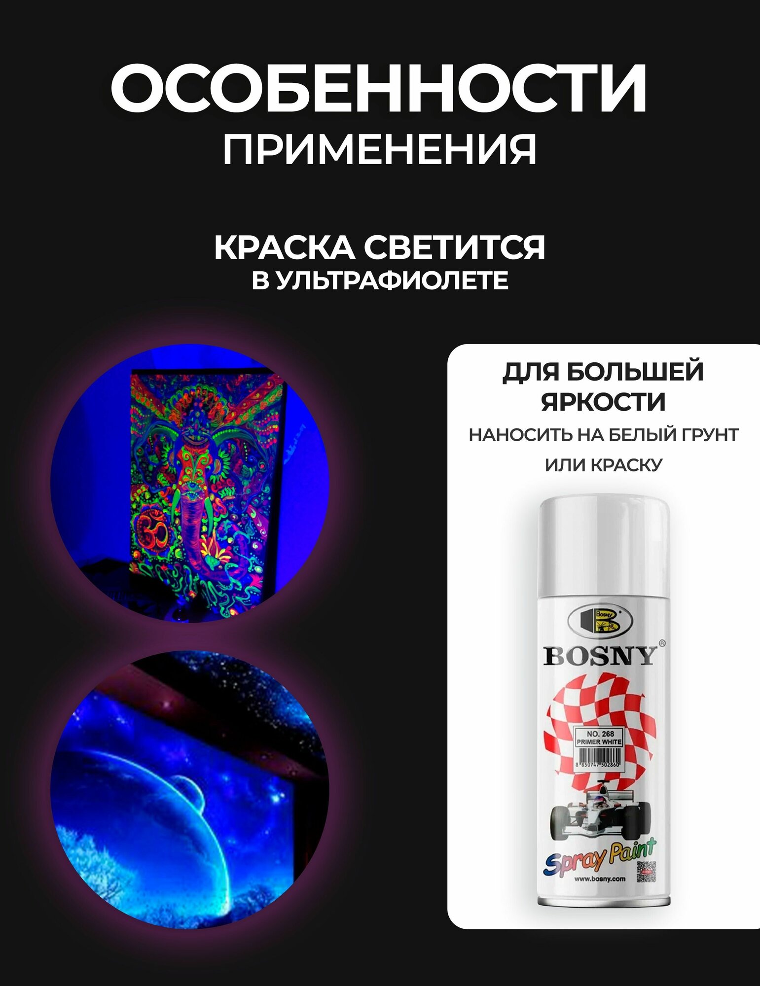 С помощью флуоресцентной акриловой краски Bosny можно без особого труда окрасить витрины, спортивный и пожарный инвентарь, рекламные щиты, самокаты, шлемы, велосипеды и многое другое. Цвет краски - желтый. Благодаря специальной формуле она светится при ультрафиолете. Спрей-краска атмосферостойкая, не выгорает и не трескается, предотвращает окисление и коррозию. Каждый баллон запаян в пленку. Подходит для внутреннего и наружного использования при температуре не ниже +10 С.