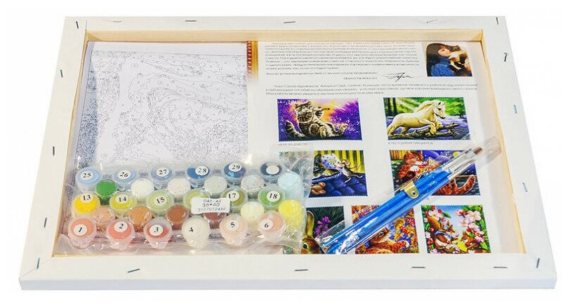 | Состав набора | холст на подрамнике с нанесенным рисунком,контрольный лист с нанесенной схемой,набор акриловых красок,кисти – 3 шт.,крепление для готовой картины |