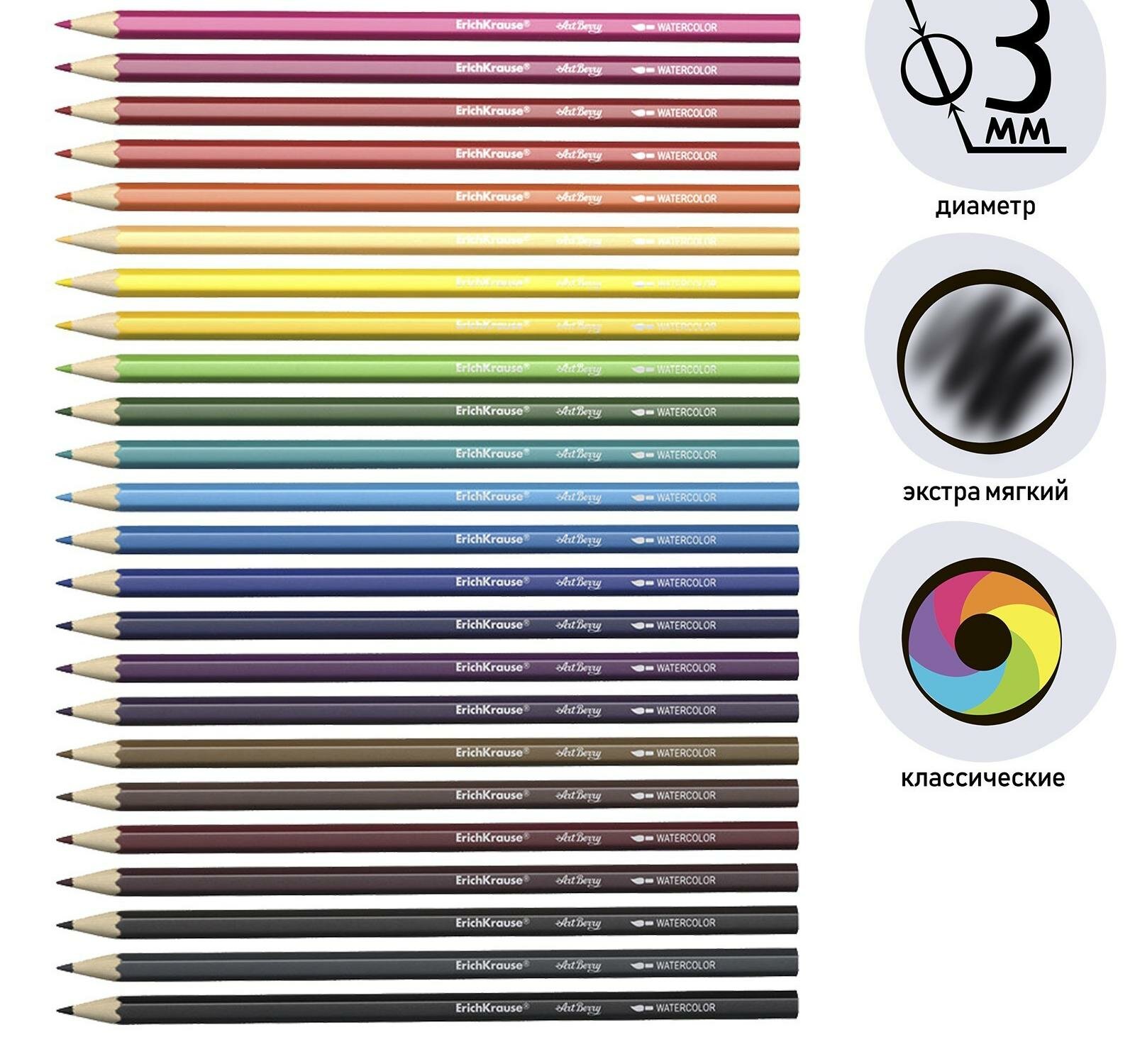 Акварельные шестигранные цветные карандаши из отборной древесины с суперярким грифелем. После нанесения на бумагу след от карандаша может быть использовн для создания акварельного эффекта при помощи воды и кисточки, входящей в комплект. Грифель диаметром 3 мм не царапает бумагу и не крошится при рисовании. Специальная пропитка древесины и сплошная проклейка грифеля обеспечивают высокую ударопрочность. Мягкая древесина и идеальная центровка грифеля гарантируют легкую заточку с экономным расходом карандаша. Европейский сертификат качества (СЕ) гарантирует отсутствие в составе токсичных веществ.