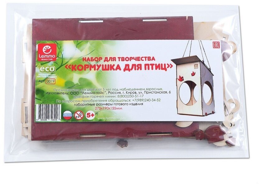Экологически чистые, развивающие конструкторы от российского производителя Lemmo помогут вашему ребенку развить мелкую моторику рук, воображение, пространственное мышление, логику и предметное моделирование. Все детали выполнены из качественной древесины и имеют сильный насыщенный запах дерева. Наборы укомплектованы клеем ПВА и наждачной бумагой. Любой конструктор после сборки можно раскрасить акриловыми и гуашевыми красками, но даже без этого в результате получается полноценная красивая игрушка с подвижными элементами. Деревянный конструктор Кормушка отличный выбор, если вы хотите воспитать у своего ребенка чувство ответственности за все живое на земле, развить чуткость, доброту и познавательный интерес к природе. Дети будут рады сделать кормушку для птиц своими руками. Она легко собирается, вам даже не понадобится клей. А если вы захотите повесить кормушку в лесу или на своем дачном участке, не забудьте покрыть собранную модель лаком, чтобы она была устойчива к влажной погоде. Размеры: 270x190x155 мм Что в наборе: наждачная бумага, подробная инструкция.