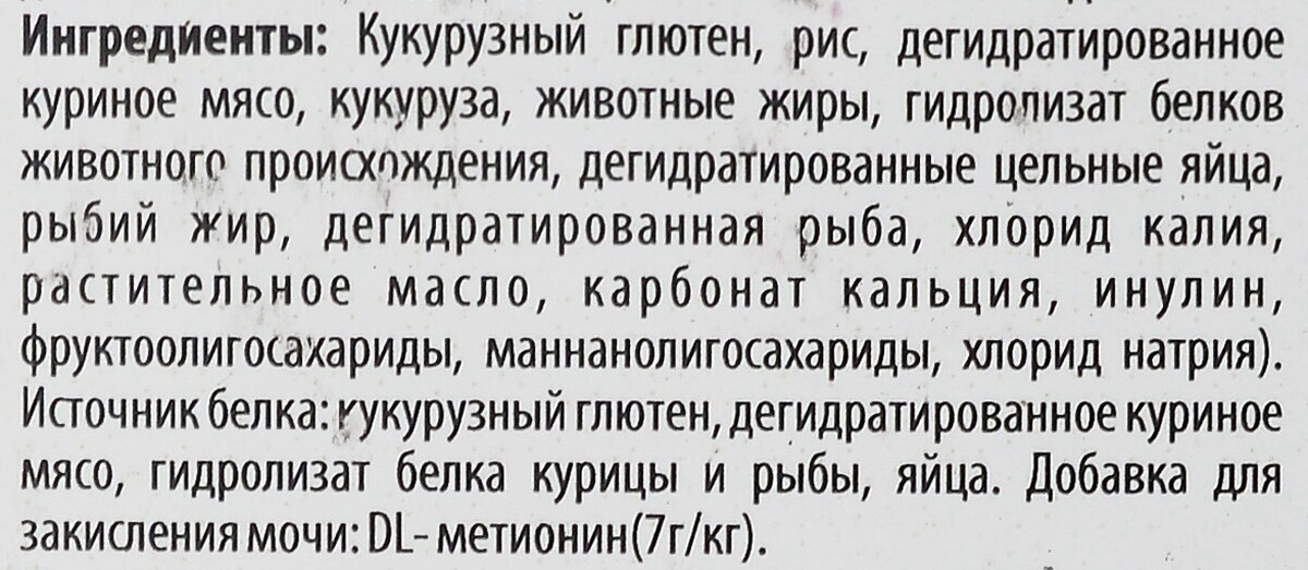 | Состав | ИНГРЕДИЕНТЫ Кукурузный глютен, рис, дегидратированное куриное мясо, овес, животные жиры, гидролизат белков животного происхождения, дегидратированные цельные яйца, рыбий жир, дегидратированная рыба, хлорид калия, растительное масло, сульфат кальция дигидрат, карбонат кальция, инулин, фруктоолигосахариды, маннанолигосахариды, хлорид натрия, экстракт календулы (источник лютеина). Источник белка: кукурузный глютен, дегидратированное куриное мясо, гидролизат белка курицы и рыбы, яйца, рыба. Добавка для контроля рН мочи: DL-метионин(7г/кг), сульфат кальция дигидрат (5г/кг). |