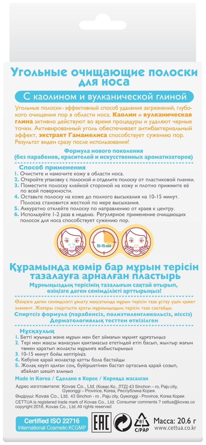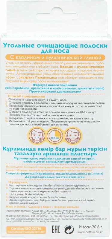 Чистота кожи до кончика носа! Угольные полоски - эффективный способ удаления загрязнений, глубокого очищения пор в области носа. Каолин и вулканическая глина активно действует во время процедуры и удаляют черные точки. Активированный уголь обеспечивает антибактериальный эффект, экстракт Гамамелиса способствует сокращению пор. Результат виден сразу после использования. Протестировано дерматологами. Cettua – тканевая косметика моментального эффекта Красивая и здоровая кожа – легче, чем ты думаешь!