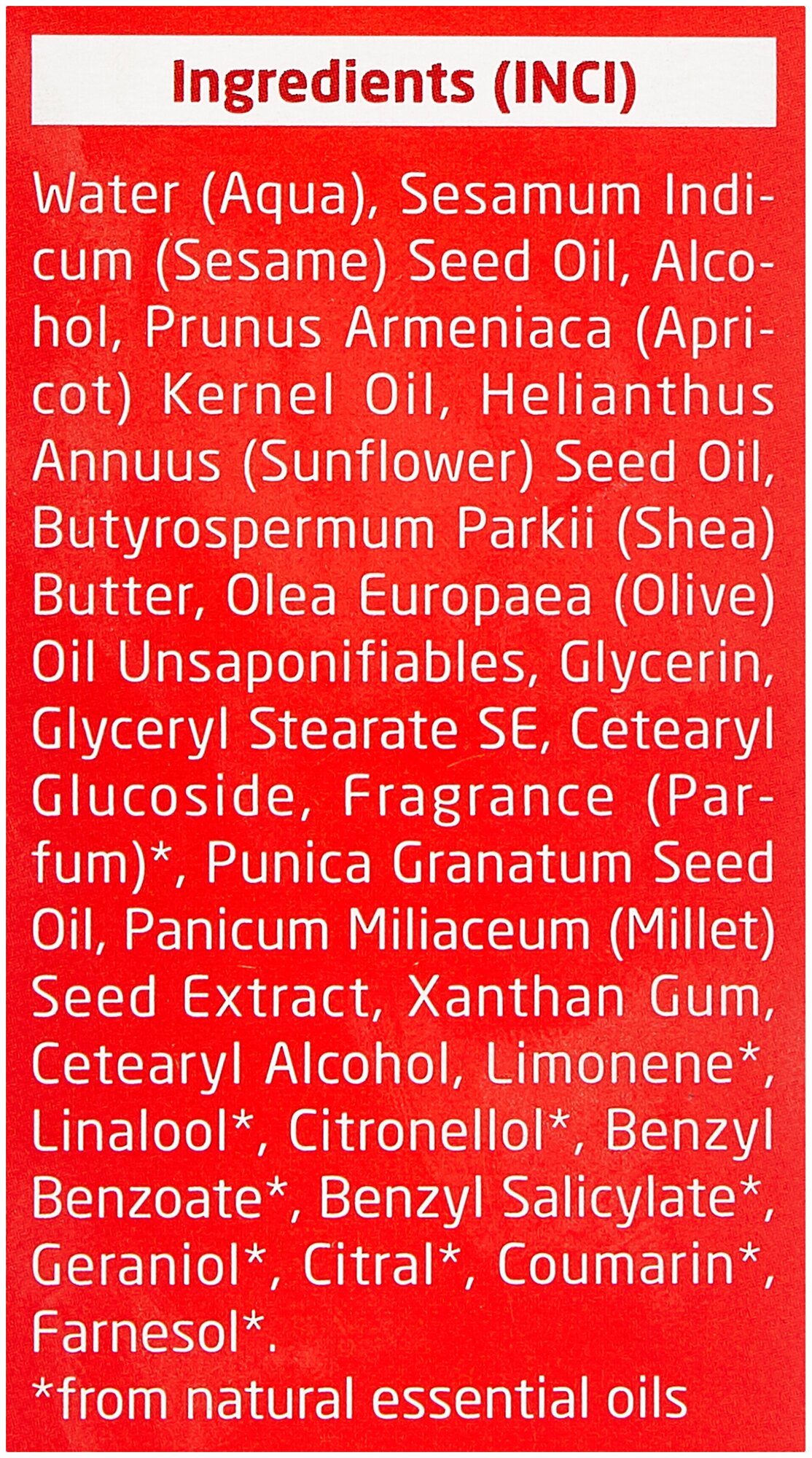 | Состав | Water (Aqua) Sesamum Indicum Seed Oil Alcohol Prunus Armeniaca Kernel Oil Helianthus Annuus Seed Oil Butyrospermum Parkii Butter Olea Europaea Oil Unsaponifiables Glycerin Glyceryl Stearate SE Cetearyl Glucoside Punica Granatum Seed Oil Panicum Miliaceum Seed Extract Xanthan Gum Cetearyl Alcohol Fragrance (Parfum)* Limonene*1 Linalool*1 Citronellol* Benzyl Benzoate*1 Benzyl Salicylate*1 Geraniol* Citral* Coumarin* Farnesol* |