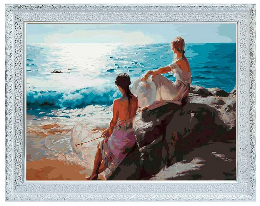 Набор для живописи «У самого синего моря» иллюстрирует нам красивую картинку – морской пейзаж, где в образе главных героинь расположились две юные девушки. Их молодой возраст выдают худощавость, хрупкость тела, а также фасон платьев. Что связано с этими образами? Какую историю вы можете предложить в качестве эпиграфа к картине? Мы предлагаем вам подключить свое вдохновение, чтобы подарить этим девушкам не только визуальный образ, но и определенное настроение, историю.