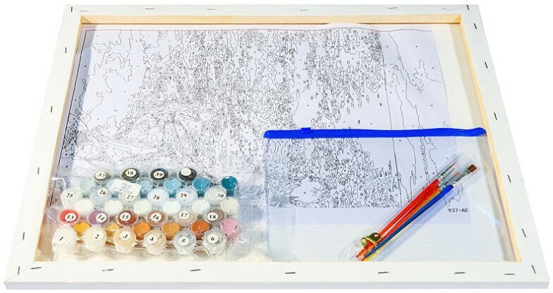 | Состав набора | холст на подрамнике с нанесенным рисунком, контрольный лист с нанесенной схемой, набор акриловых красок, кисти – 3 шт., крепление для готовой картины |