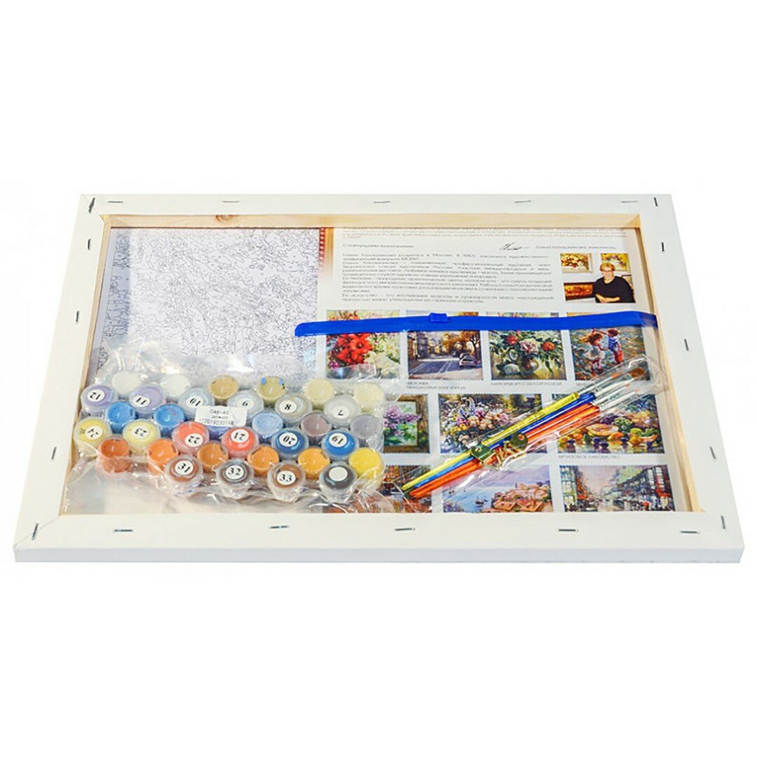 Ваши главные помощники - контрольный лист, кисти и комплект акриловых красок, расфасованных по баночкам с номерами.