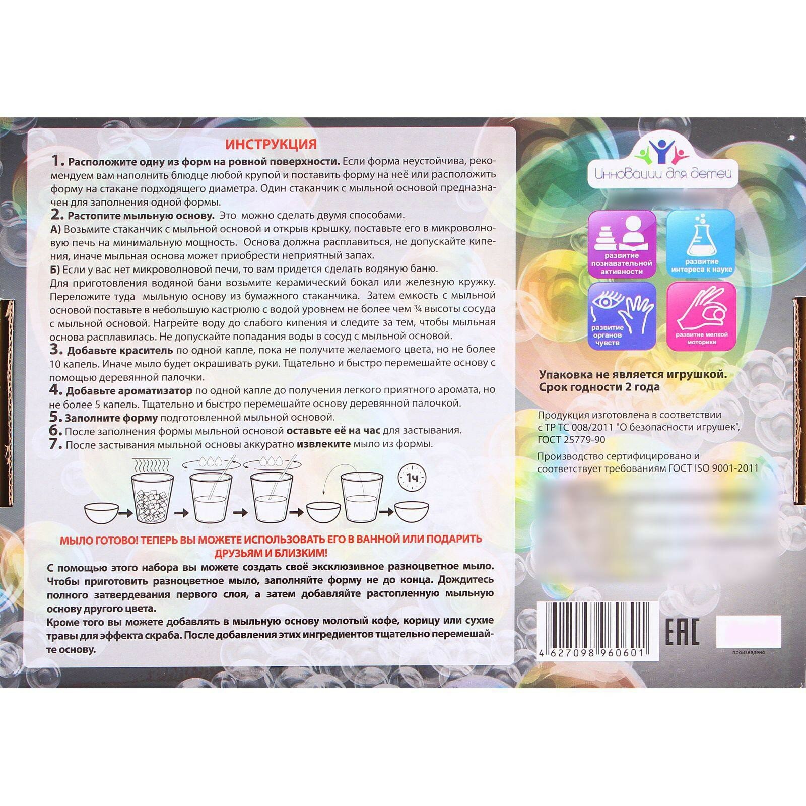 | Состав набора | 3 формочки для мыла; Защитные перчатки; Красители и ароматизаторы; Мыльная основа; Палочки для размешивания; Чаша из керамики для растапливания мыла |