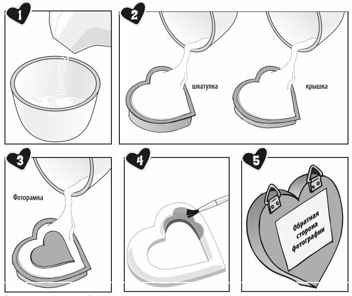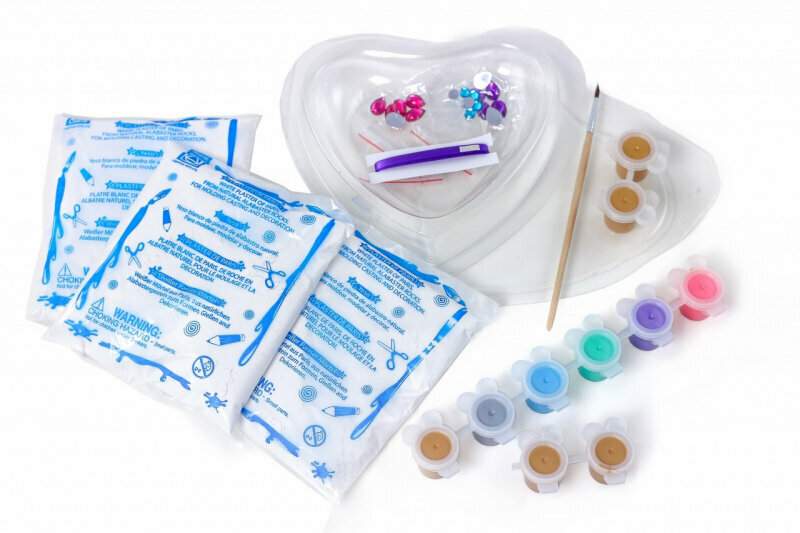 | Состав набора | 3 формочки в виде сердечек, 6 баночек краски (по 3 мл каждый), 1 большая баночка краски (22 мл), 20 цветных декоративных камней, кисть, 2 крючка, 3 пакета с гипсом (каждый около 250 г), лента (около 1 м) |