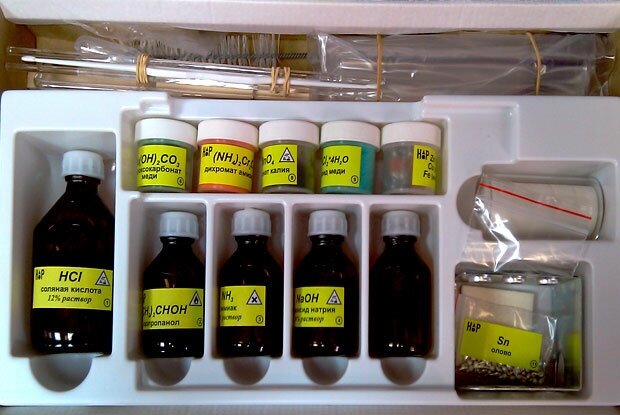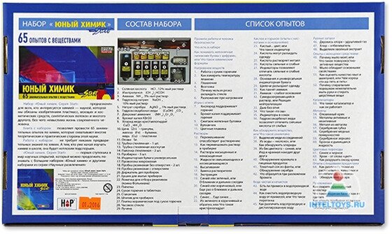| Комплектация | банки с химическими веществами, химические инструменты, книга с инструкцией. |