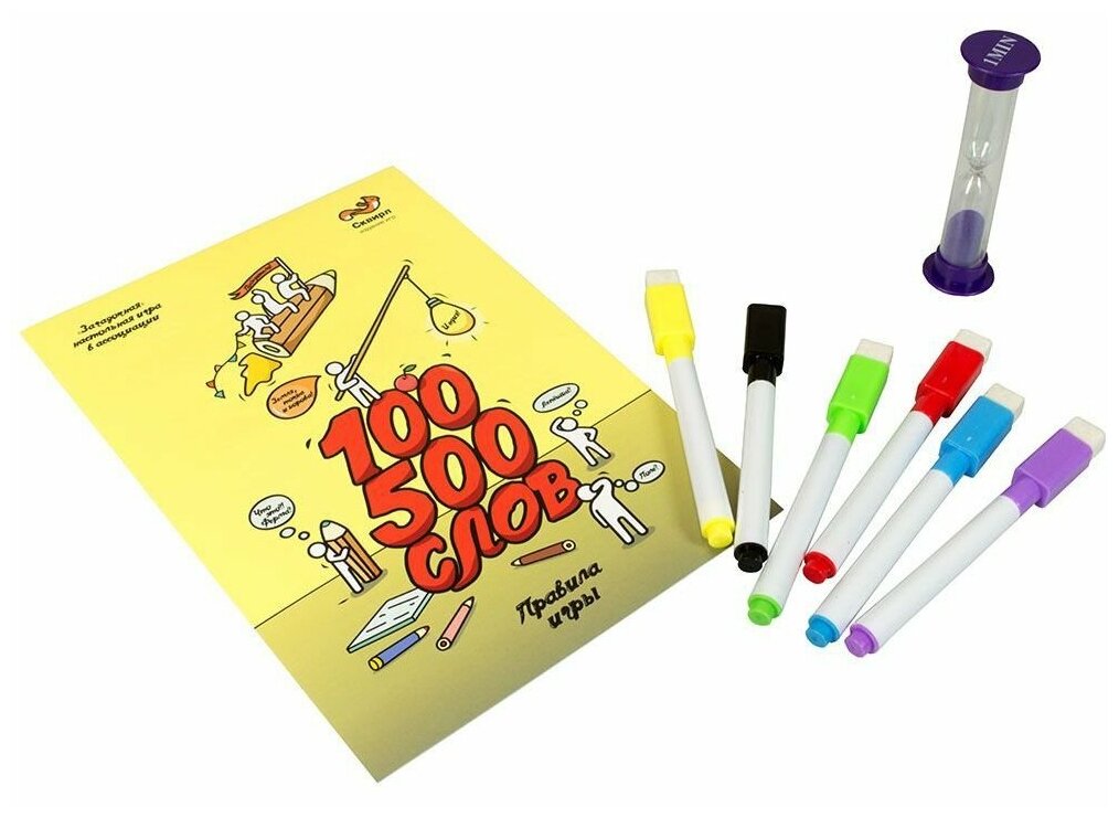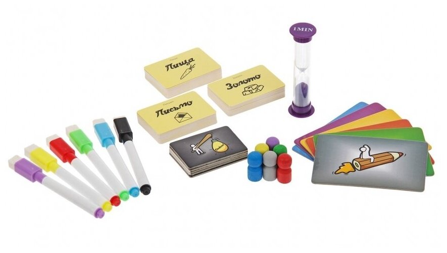 | Комплектация | 100 карт со словами; 6 планшетов для письма; 6 маркеров; планшеты загаданных слов; песочные часы; 6 фишек игроков; правила |