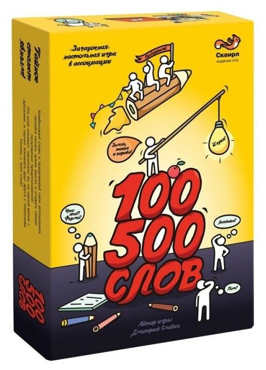 Сквирл Настольная игра 100500 слов Комбинируй слова и придумывай свои ассоциации, пытайся понять чужие мысли и угадать самые популярные предположения! Эта игра покажет, насколько вы на одной волне с друзьями, и научит понимать друг друга с полуслова. Точнее, с трех слов! Комбинации обычных слов могут рождать самые невероятные ассоциации, которые на первый взгляд не очевидны. И вы будете приятно удивлены, когда ваши мысли совпадут с мыслями других! Комплектация: 100 карт со словами 6 планшетов для письма 6 маркеров Планшеты загаданных слов Песочные часы 6 фишек игроков Правила