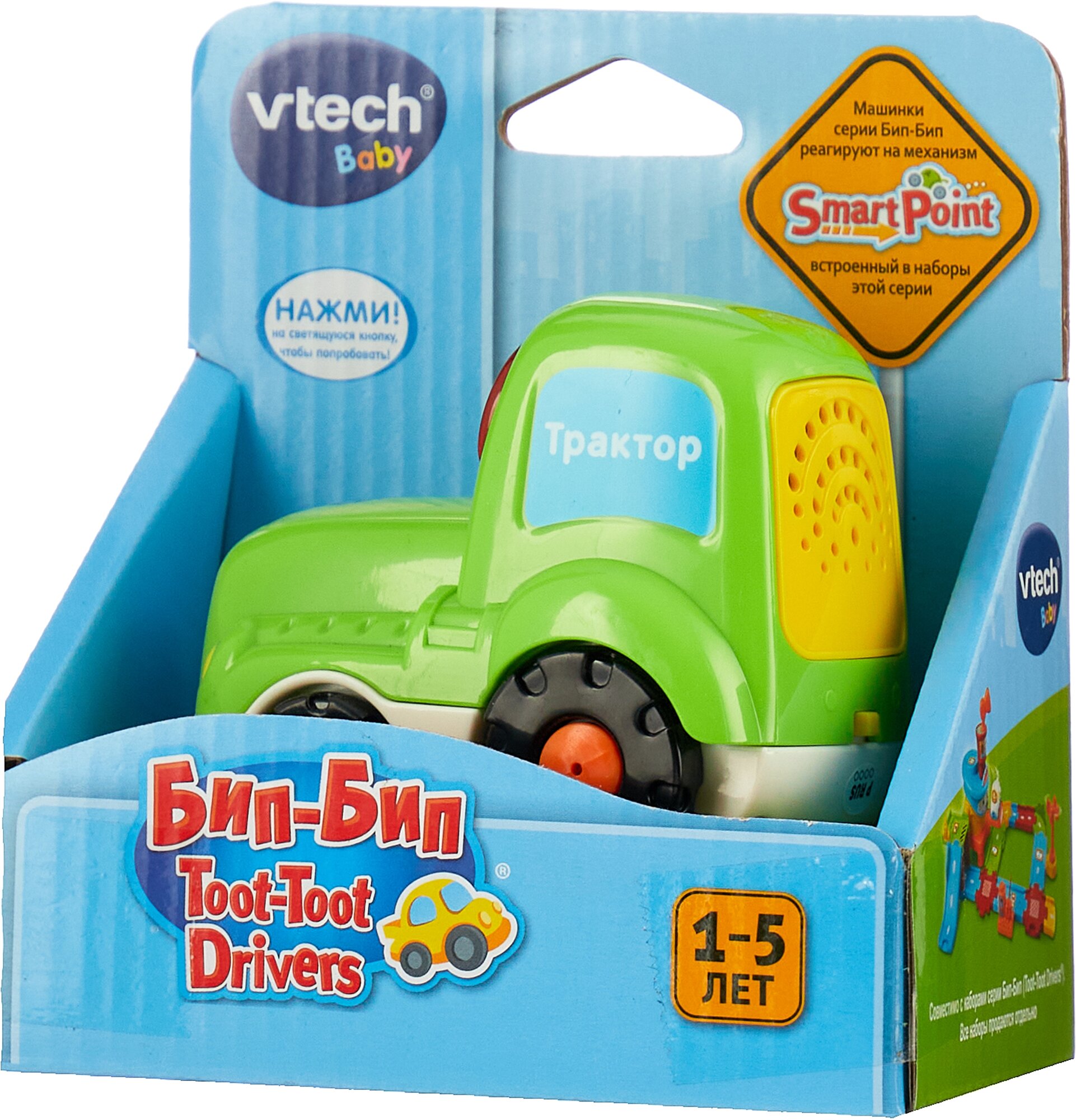 Трактор из серии игрушек Бип-Бип Toot-Toot Drivers от бренда VTech – великолепная игрушка для детей от одного года, с которой малыши смогут не только играть, но и узнавать много нового, развивать мелкую моторику и пополнять словарный запас. Игрушка снабжена уникальной технологией SmartPoint ("умные точки"), разработанной компанией VTech. Технология SmartPoint позволяет машинке воспроизводить фразы, музыку и веселые звуки.