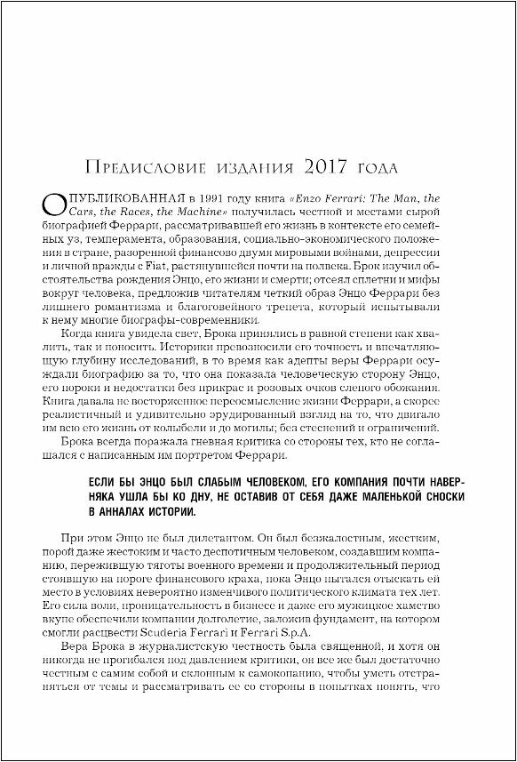 Что ж, дамы и господа, прошу любить и жаловать самую авторитетную и полную биографию его величества коммендаторе Энцо Феррари. Если честно, уже предисловие книги явно дает понять, что пафос в ее основном содержании будет просто зашкаливать. Вдобавок она перегружена несметным количеством имен и мелких фактов, которые не только отвлекут вас от познания личности Феррари, но и сделают прочтение книги почти мучительным. На этом фоне даже издание пятилетней давности про жизнь Берни Экклстоуна выглядит детской книжкой с картинками. Кстати, будьте готовы к тому, что в данном книге иллюстраций не будет. Совсем.