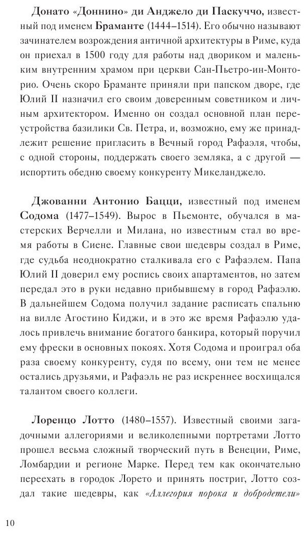 Рафаэль Санти прожил всего тридцать семь лет, но за свою недолгую жизнь успел добиться невероятных высот и сделать головокружительную карьеру художника. Талантливый мастер, делец, обаятельный руководитель - он по праву считается одним из символов итальянского искусства. Его жизнь была очень насыщенной: он успевал совмещать несколько крупных проектов, работу в мастерской и светскую жизнь. Произведения Рафаэля полны удивительных и неожиданных деталей, которые могут многое рассказать как о биографии художника, так и о его окружении. Почему Платон в "Афинской школе" внешне так похож на Леонардо да Винчи? Кто изображен на одной из самых загадочных картин эпохи Возрождения, "Форнарине"? В каких произведениях Рафаэля ясно прослеживается вечное соперничество с Микеланджело? Основываясь на письмах, дневниках, свидетельствах современников и, конечно же, на анализе полотен великого художника, автор раскроет тайны его жизни и творчества и даст ключи к пониманию его живописи.