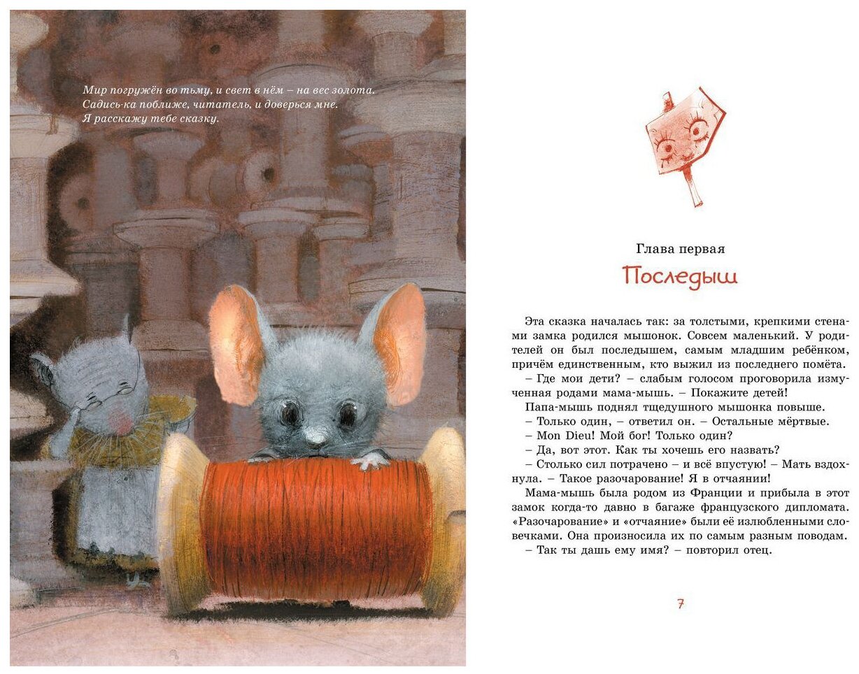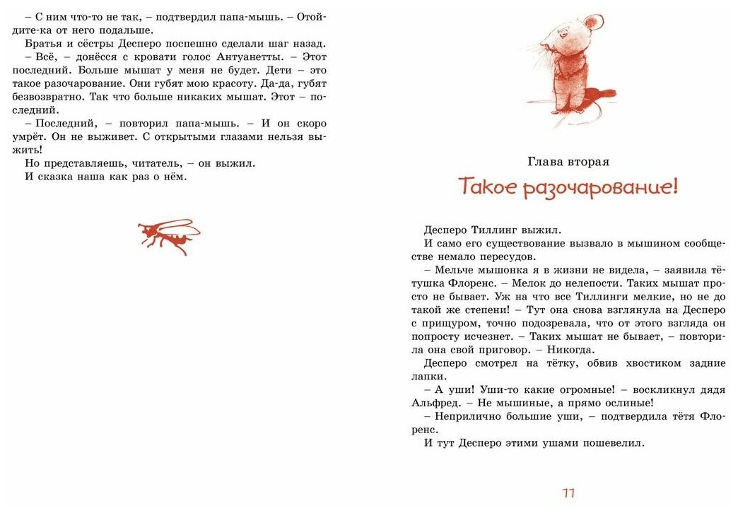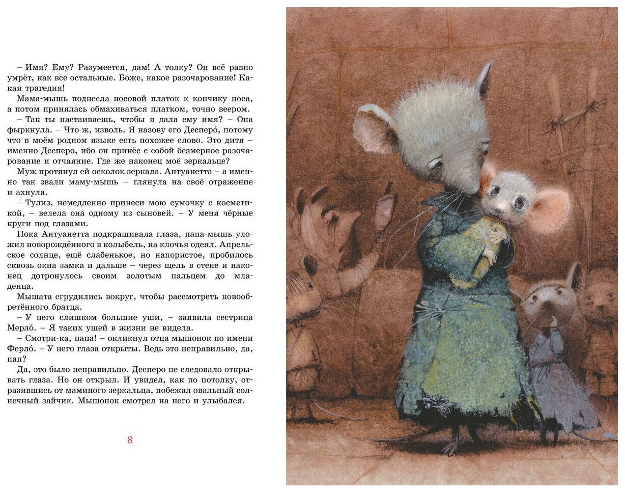 Очень трогательная, приключенческая, моментами по-детски страшная и поучительная история о Мышонке Десперо. Поднимаются очень нужные темы: любовь, прощение, смелость, свой путь, индивидуальность. История не оставит равнодушным. Читается легко и интересно! Очень советую. Стильные иллюстрации, книжка приятная на ощупь! Издательство Махаон очень радует своими книжками!