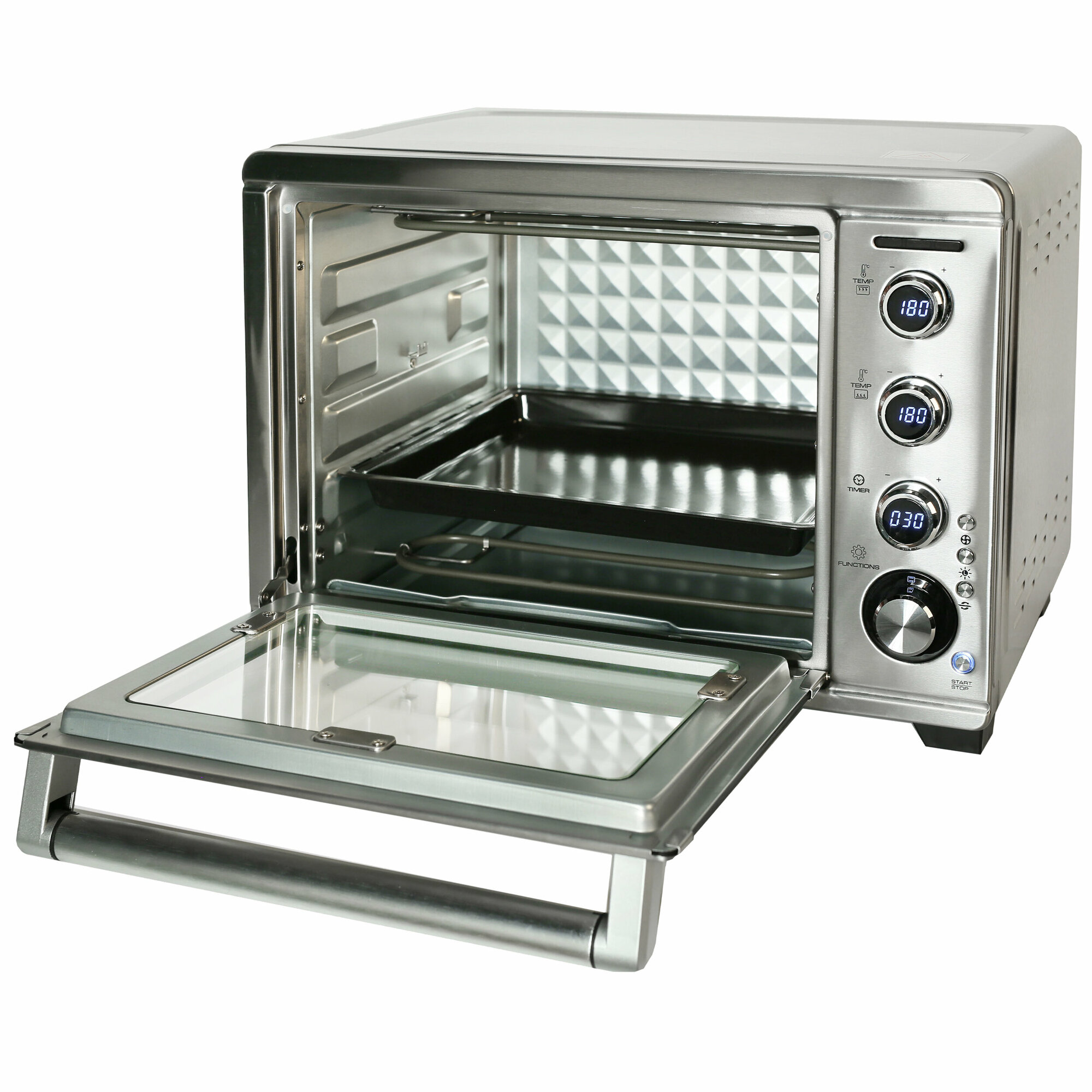 Техника для дома Gemlux Электрическая конвекционная печь Gemlux имеет компактные размеры, небольшой вес и может быть с успехом использована как полноценная замена электрической духовке и на малогабаритной городской кухне, и на даче. Оборудование имеет прочный и гигиеничный корпус из нержавеющей стали и оригинальное электронное управление. Температура верхнего и нижнего нагревательных элементов и время приготовления регулируются вращением трех ручек. Заданные значения параметров выводятся на три ЖК-дисплея, которые производитель разместил на тех же ручках. Выглядит это весьма эффектно и необычно. Выбирайте подходящий из 8 режимов приготовления и наслаждайтесь любимыми блюдами или выпечкой. Камера печи достаточно вместительна: вы сможете готовить в ней цыпленка-гриль на вертеле целиком, мясо и овощи в форме для запекания, хлеб, пиццу диаметром 30 см и многое другое. Конвекция значительно ускоряет процесс жарки и выпечки и делает его более равномерным, а выдвижной поддон для крошек упрощает очистку.