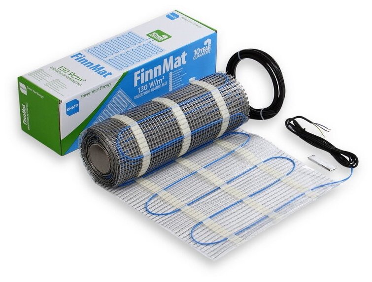 FinnMat - нагревательный мат 130 Вт/м² без терморегулятора. Нагревательные маты FinnMat с мощностью 130 Вт/м² предназначены для прямого и комфортного отопления пола в сухих, влажных и недостаточно теплоизолированных помещениях с каменными, бетонными полами и полами с кафельной плиткой. Не требует образования бетонной стяжки, может укладываться в плиточный клей. Номинальное напряжение - 230В. Длина питающего кабеля - 2.5 м. Ширина мата - 0,5 м.