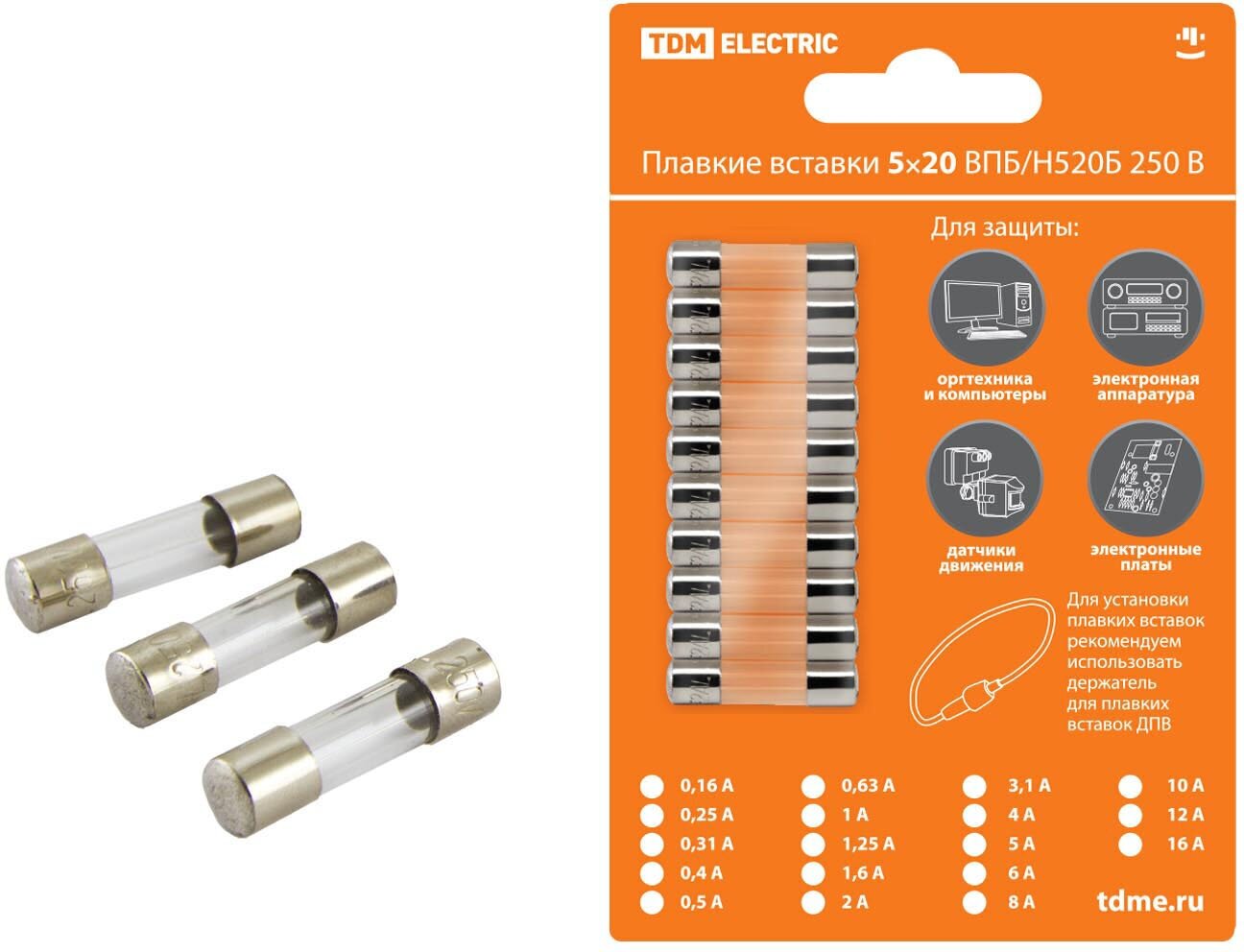 Назначение:Защита кабельных линий от перегрузок и коротких замыканий. В качестве токоограничительного элемента в широком спектре устройств.Применение:Различные шкафы и сборки – в качестве элемента защиты линий. Бытовая техника: телевизоры, холодильники, печи СВЧ и т. д. Для защиты полупроводниковых устройств: датчиков движения, сенсоров, фотореле и т. д.Для защиты светильников.Преимущества:Надежная и недорогая защита линий и устройств.Плавкие вставки упакованы в блистер со всей необходимой для выбора информацией и штрихкодом EAN-13. Возможность подключения держателя ДПВ на провод в разрыве линии для защиты большого количества устройств: светильников, датчиков движения и т. д.Компактный размер держателя ДПВ на провод позволяет устанавливать его в ограниченных пространствах рядом с устройствами, либо непосредственно в них.Материалы:Контактная группа предохранителей выполнена из никелированной электротехнической медиКонтактная группа держателей выполнена из латуни.