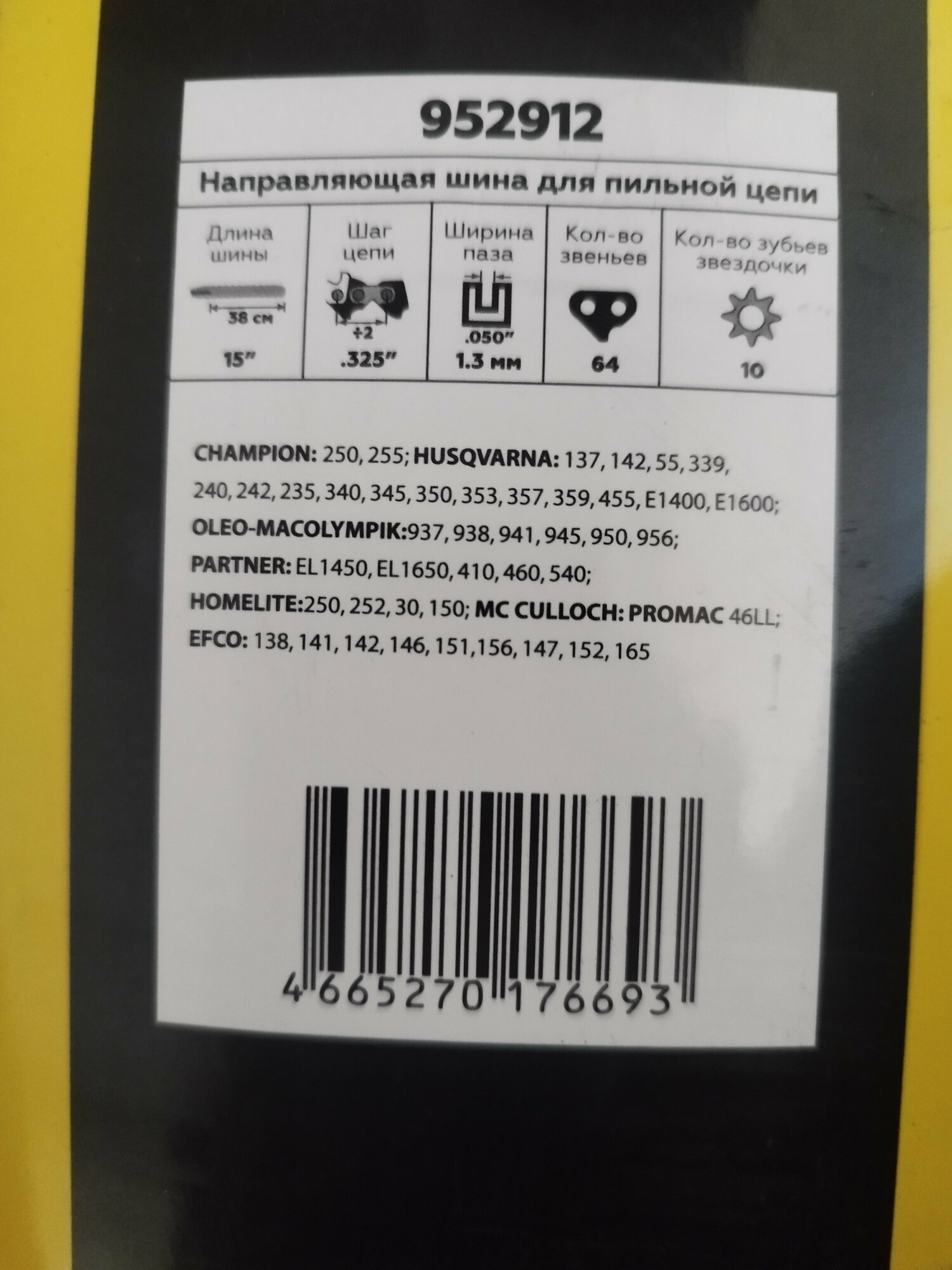 | Совместимая техника | 16" (Husqvarna) (137,142,55,339,240,242,235,340,345,350,353,357,359,455,E1400,E16), 16" (Partner) (EL1450, EL1650, 410, 460, 540), 16" (Oleo-mac) (OLEO-MAC-OLYMPIK 937, 938, 941, 945, 950, 956), 16" (Efco) (138, 141, 142, 146, 151, 156, 147, 152, 165), 16" (Champion) (255) |