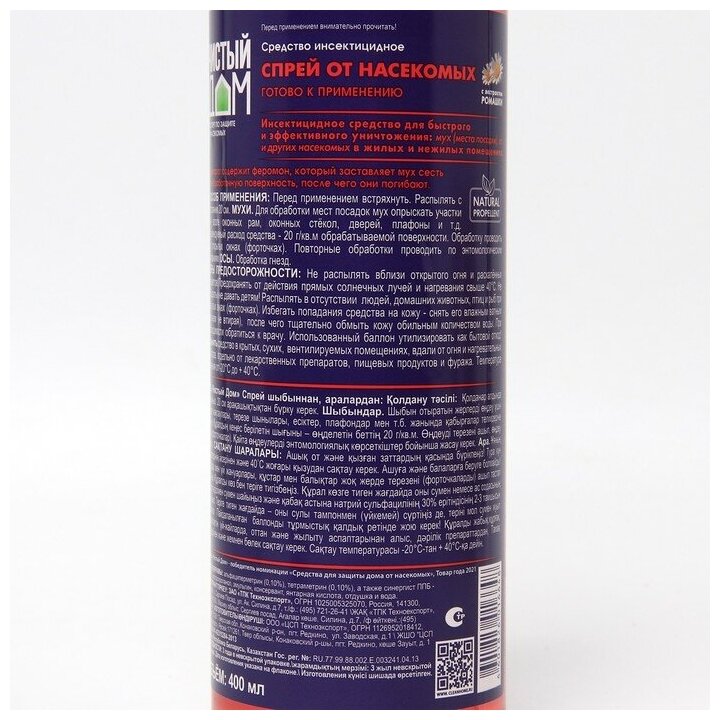 Спрей Чистый дом от мух и ос отличается повышенными защитными свойствами и мгновенным эффектом. Буквально за одно применение данная продукция поможет очистить вашу квартиру или дом от назойливых насекомых. Спрей прост и удобен в использовании. Флакона 400 мл хватит на долгое время. Состав абсолютно безопасен для здоровья человека и окружающей среды.